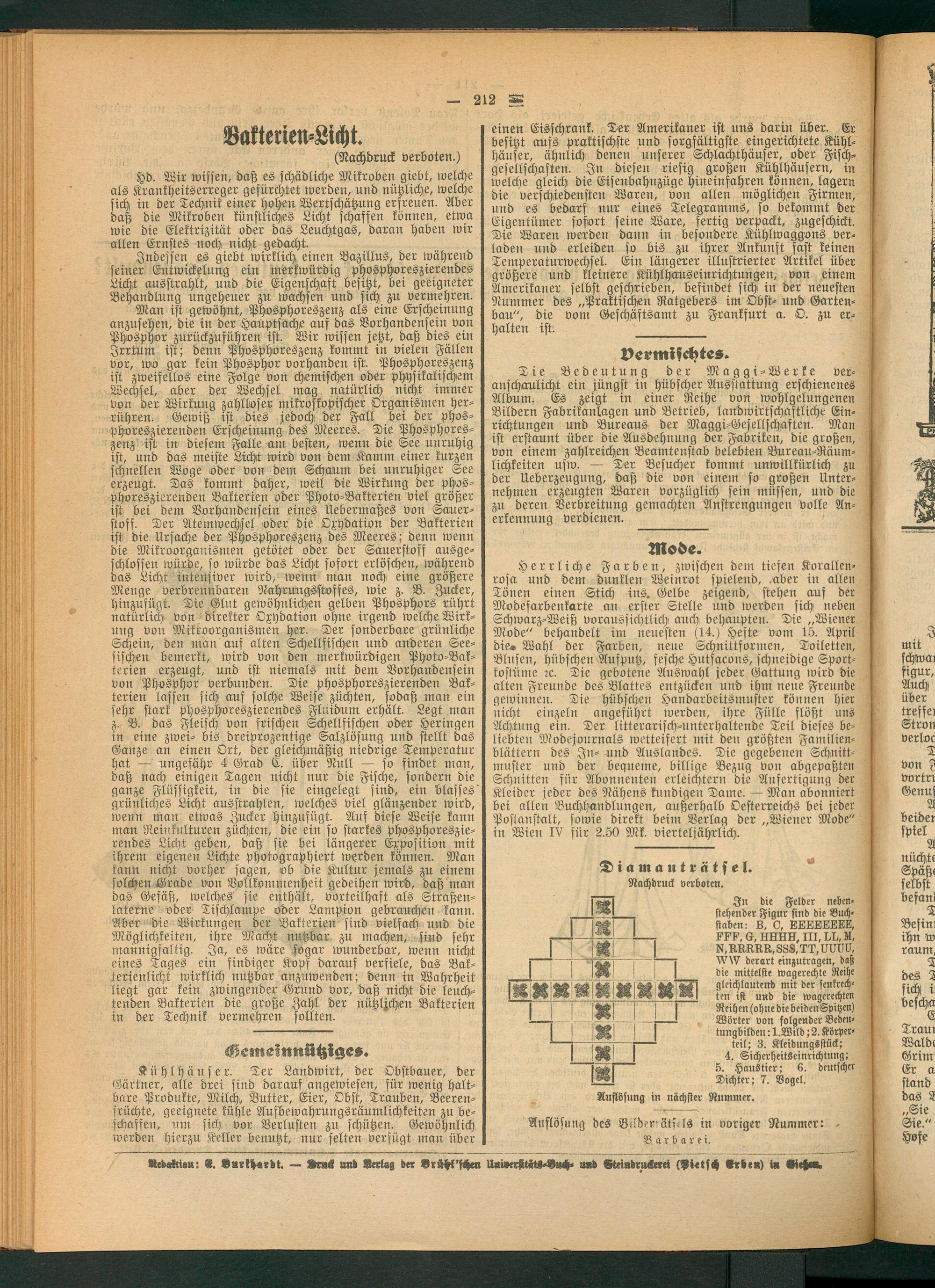 Hd. Wir wissen, daß es schädliche Mikroben giebt, welche als Krankheitserreger gefürchtet werden, und nützliche, welche sich in der Technik einer hohen Wertschätzung erfreuen. Aber daß die Mikroben künstliches Licht schassen können, etwa wie die Elektrizität oder das Leuchtgas, daran haben wir allen Ernstes noch nicht gedacht.