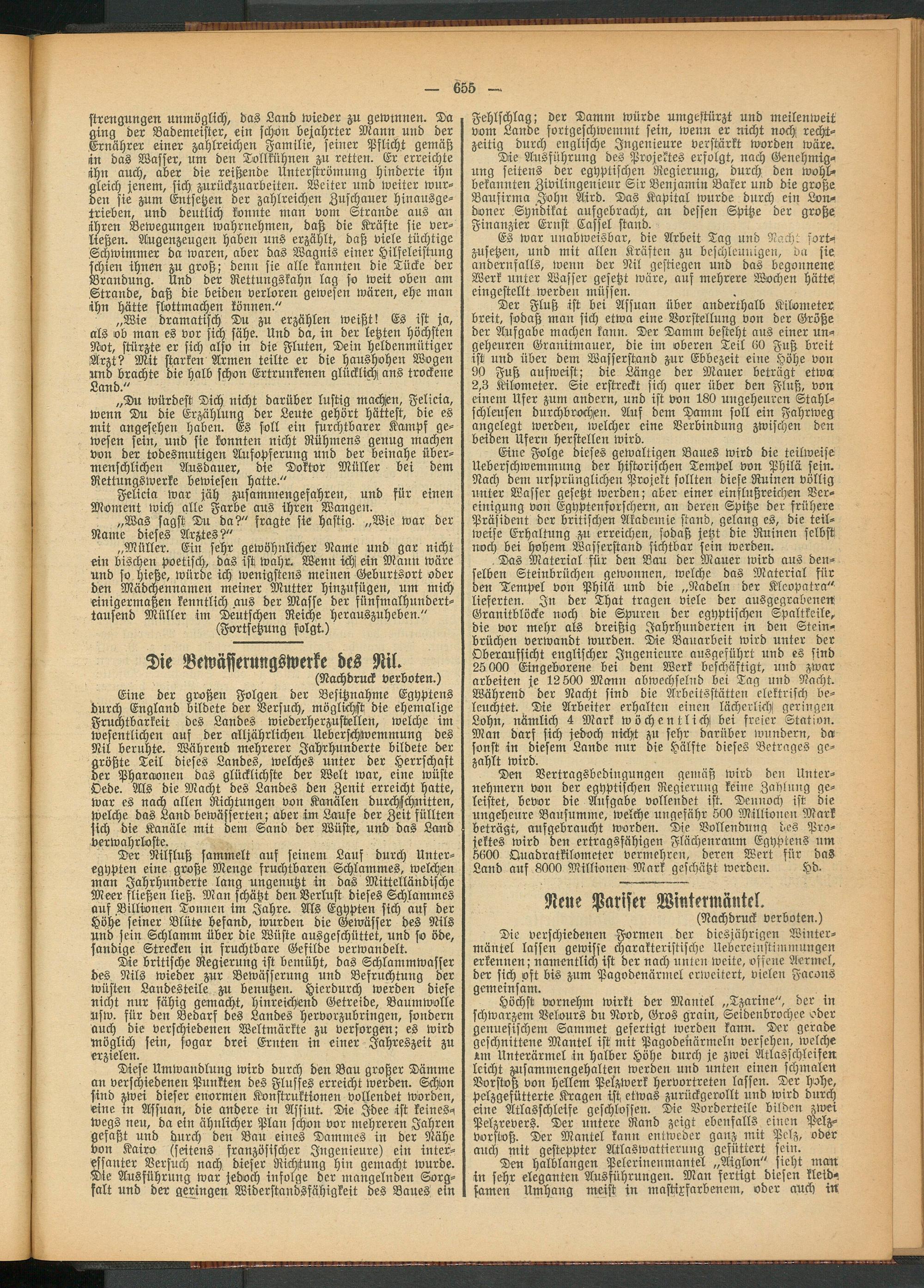 Der Fluß ist bei Assuan über anderthalb Kilometer breit, sodaß man sich etwa eine Vorstellung von der Größe der Aufgabe machen kann. Der Damm besteht aus einer ungeheuren Granitmauer, die im oberen Teil GO Fuß breit ist und über dem Wasserstand zur Ebbezeit eine Höhe von 90 Fuß aufweist; die Länge der Mauer beträgt etwa 2,3 Kilometer. Sie erstreckt sich quer über den Fluß, von einem Ufer zum andern, und ist von 180 ungeheuren Stahlschleusen durchbrochen. Auf dem Damm soll ein Fahrweg angelegt werden, welcher eine Verbindung zwischen den beiden Ufern Herstellen wird.