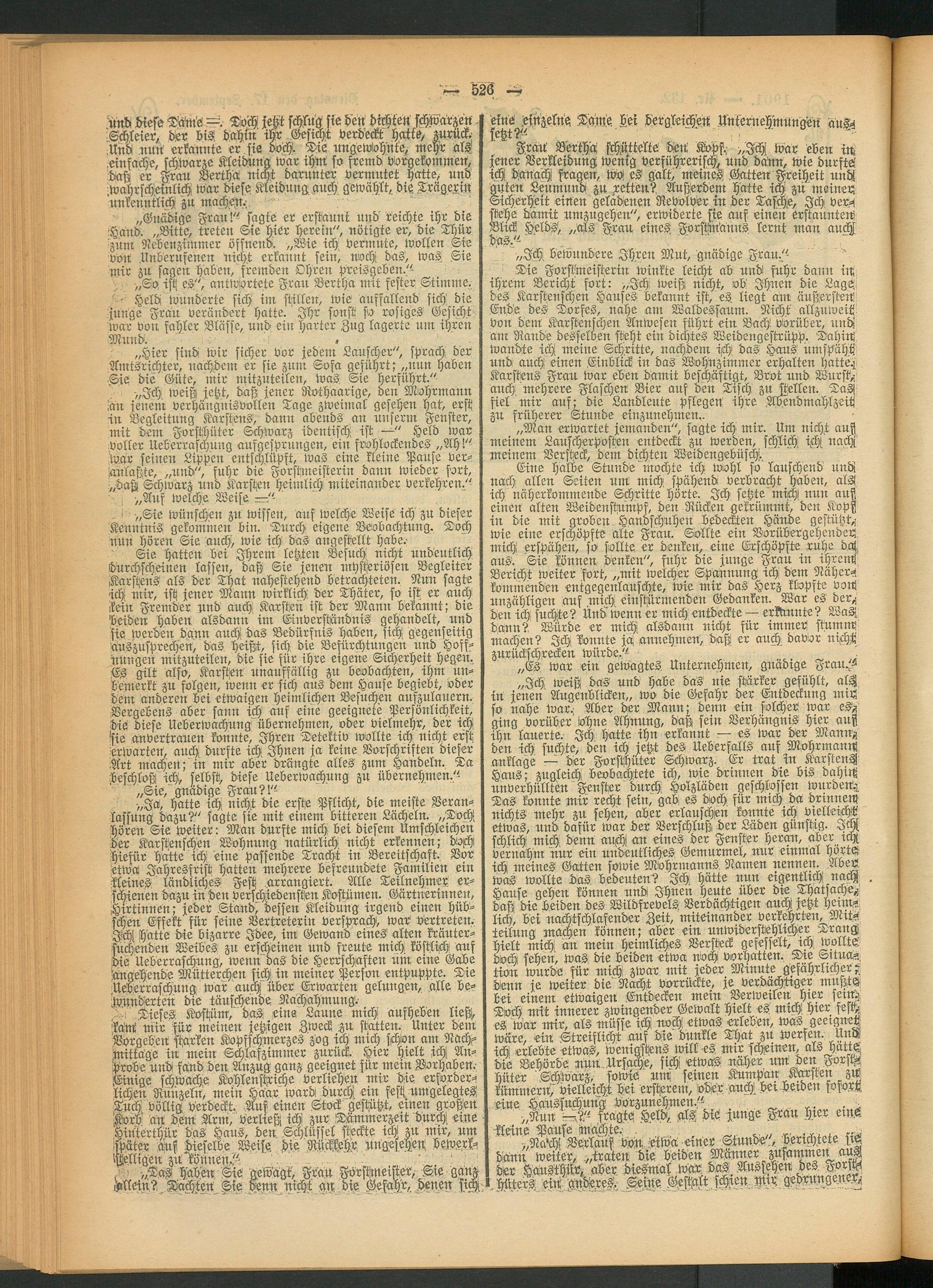 „Nach! Verlauf von Äwä einer Stunde",! berichtete ft« dänn weiter,- traten die Heiden Männer Wsammen aus der Hausthür, aber diesmal wär- das, Aussehen des Forsch 1 Hüters ein anderes. Keine Gestalt schien mir gedrungenes