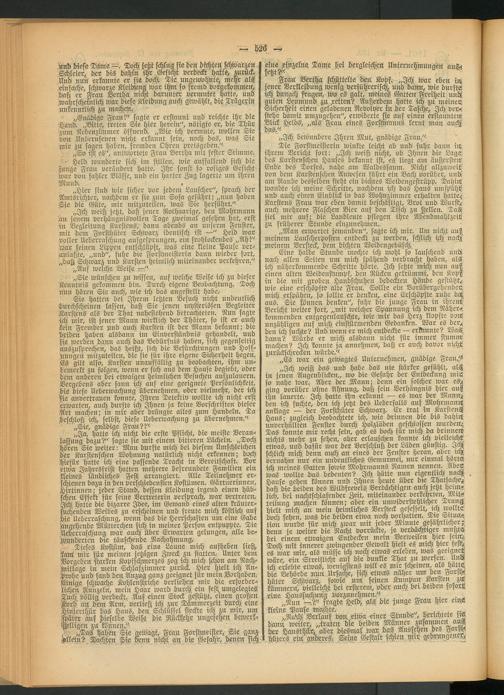 / Dieses Kostüm, das eins Laune mich aufheben ließs. käm! mir für meinen jetzigen Zweck zu statten. Unter dem Vorgeben starken Kopfschmerzes zog ich mich Won am Nachmittage in mein Schlafzimmer zurück. Hier hielt ich Anprobe und fand den Anzug ganz geeignet für mein Vorhaben, Einige schwache Kohlenstriche verliehen mir die. -erforder-! sichen Runzeln, mein Haar jvard durch ein fest umgelegtes Tuch völlig verdeckt. Auf einen Stock gestützt, einen großen 'Korb an dem Arm, verließ; ich zur Dämmerzeit durch! eine Hinterthür das Haus, den Schlüssel steckte ich zu mir, um später auf dieselbe Weise hie Rückkehr ungesehen bewerch Wligen zu können,"-