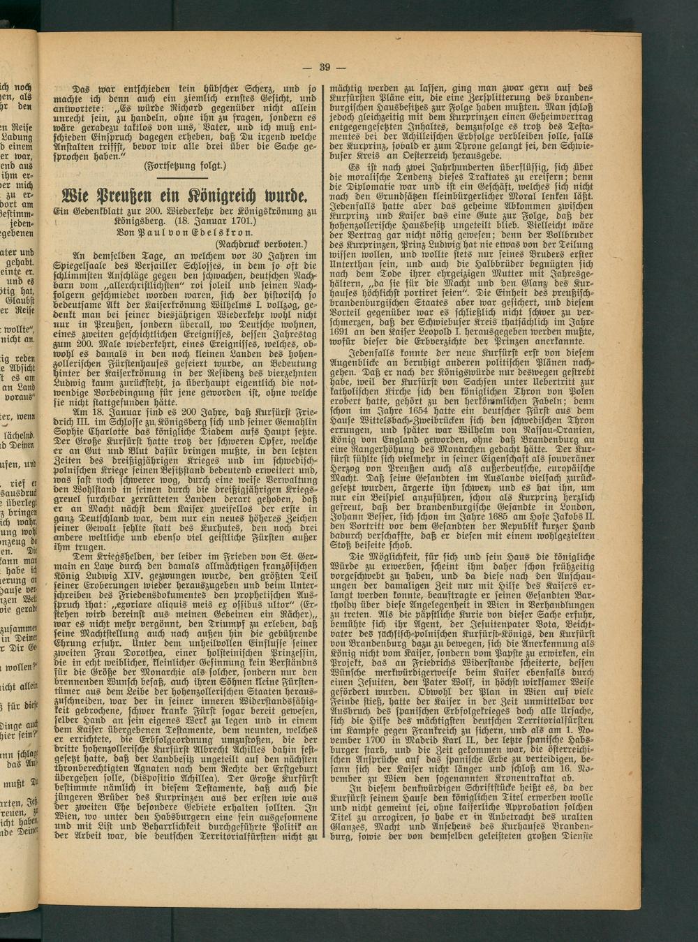 An demselben Tage, an welchem vor 30 Jahren im Spiegelsaale des Versailler Schlosses, in dem so oft die schlimmsten Anschläge gegen den schwachen, deutschen Nachk- barn vom „allerchristlichsten" rot so leit und seinen Nachfolgern geschmiedet worden waren, sich der historisch so bedeutsame Akt der Kaiserkrönung Wilhelms I. vollzog, gedenkt man bei seiner diesjährigen Wiederkehr wohl nicht nur in Preußen, sondern überall, wo Deutsche wohnen, eines zweiten geschichtlichen Ereignisses, dessen Jahrestag zum 200. Male wiederkehrt, eines Ereignisses, welches, obwohl es damals in den noch kleinen Landen des hohen- zollerischen Fürstenhauses gefeiert wurde, an Bedeutung hinter der Kaiserkrönung in der Residenz des vierzehnten Ludwig kaum zurücksteht, ja überhaupt eigentlich die notwendige Vorbedingung für jene geworden ist, ohne welche sie nicht stattgefunden hätte.