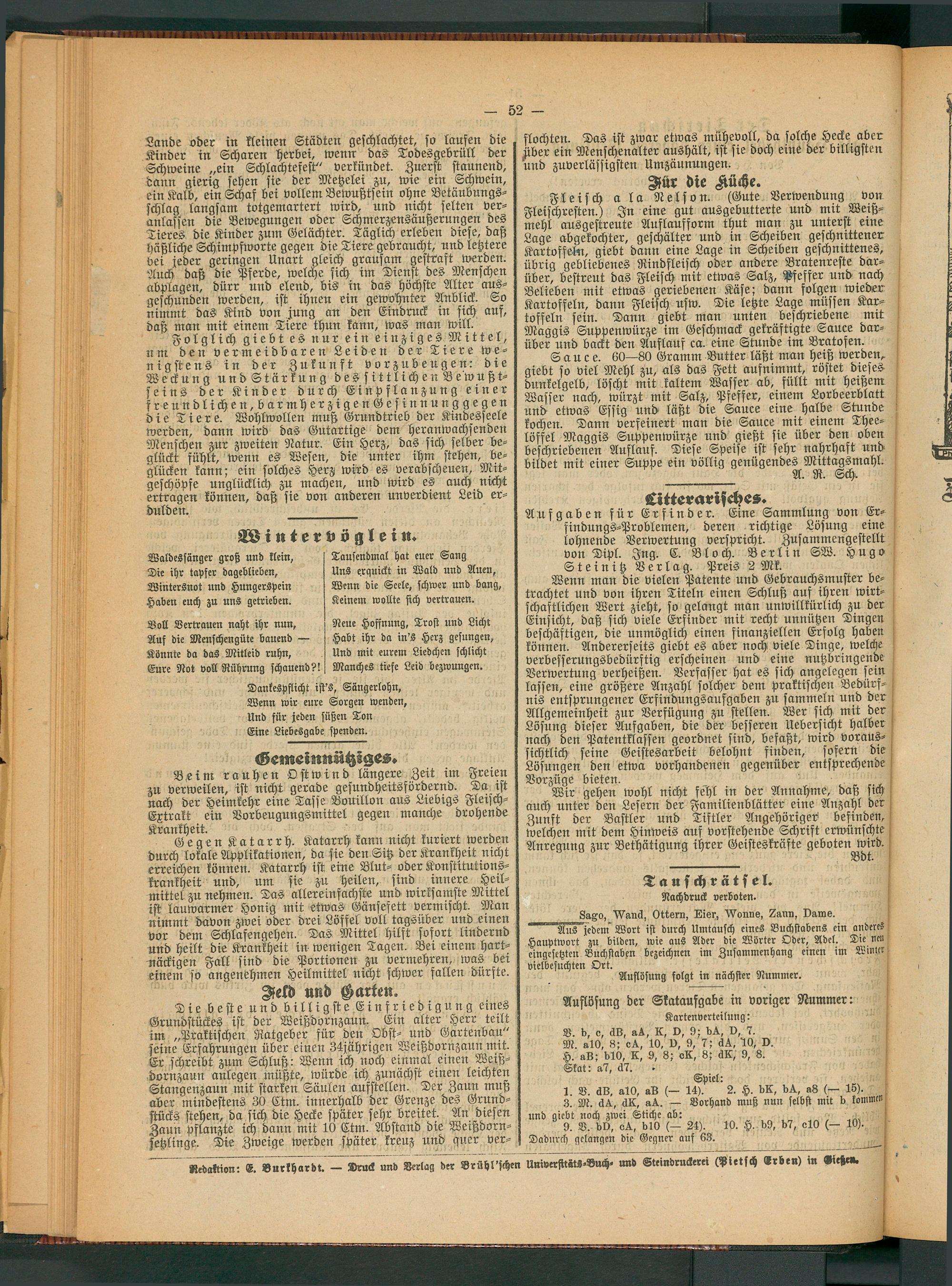 Wir gehen wohl nicht fehl in der Annahme, daß sich auch unter den Lesern der Familienblätter eine Anzahl der Zunft der Bastler und Tiftler Angehörige^ befinden, welchen mit dem Hinweis auf vorstehende Schrift erwünschte Anregung zur Bethätigung ihrer Geisteskräfte geboten wird.