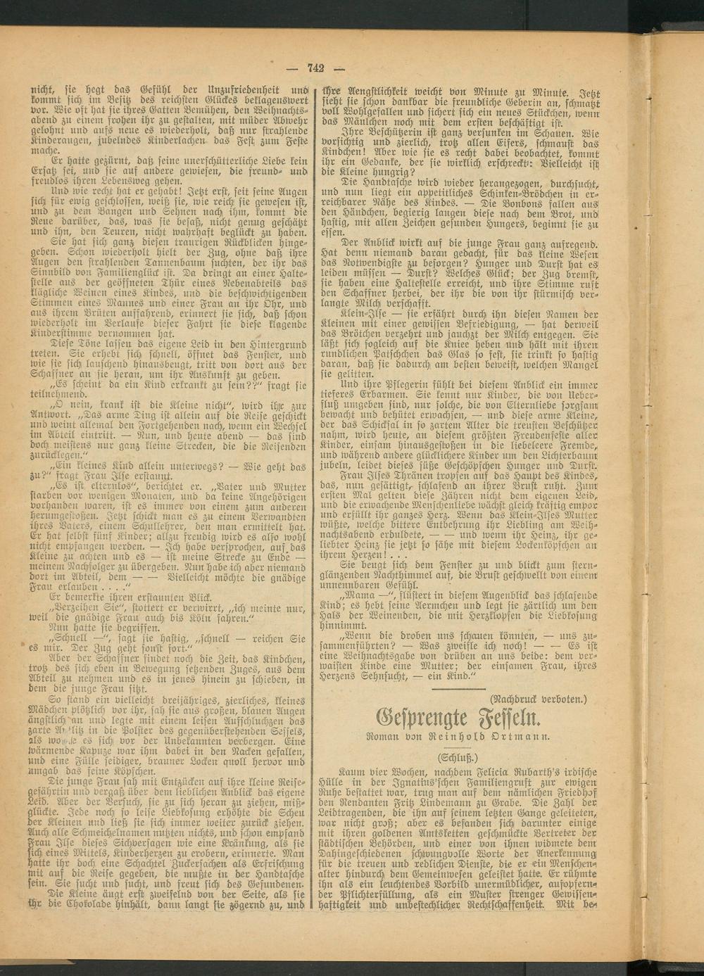 „Wenn die droben uns schlauen könnten, — uns zusammen führten? — Was zweifle ich noch! — — Es ist eine Weihnachtsgabe von drüben an uns beide: dem verwaisten Kinde eine Mutter; der einsamen Frau, ihres Herzens Sehnsucht, — ein Kind."