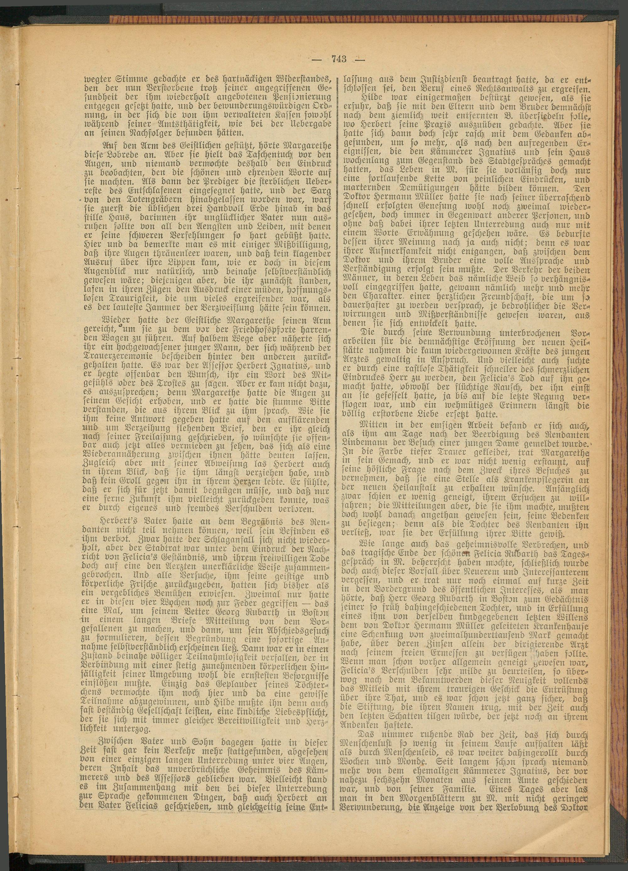 Das nimmer ruhende Rad der Zeit, das sich durch Menschenlust so wenig in seinem Laufe aufhalten läßt als durch Menschenleid, es war weiter dahingerollt durch Wochen und Monde. Seit langem schon sprach; niemand mehr von dem ehemaligen Kämmerer Ignatius, der vor nahezu sechszehn Monaten aus seinem Amte geschieden war, und von seiner Familie. Eines Tages aber taS man in den Morgenblättern zu M. mit nicht geringen Verwunderung, die Anzeige von der Verlobung des Doktor