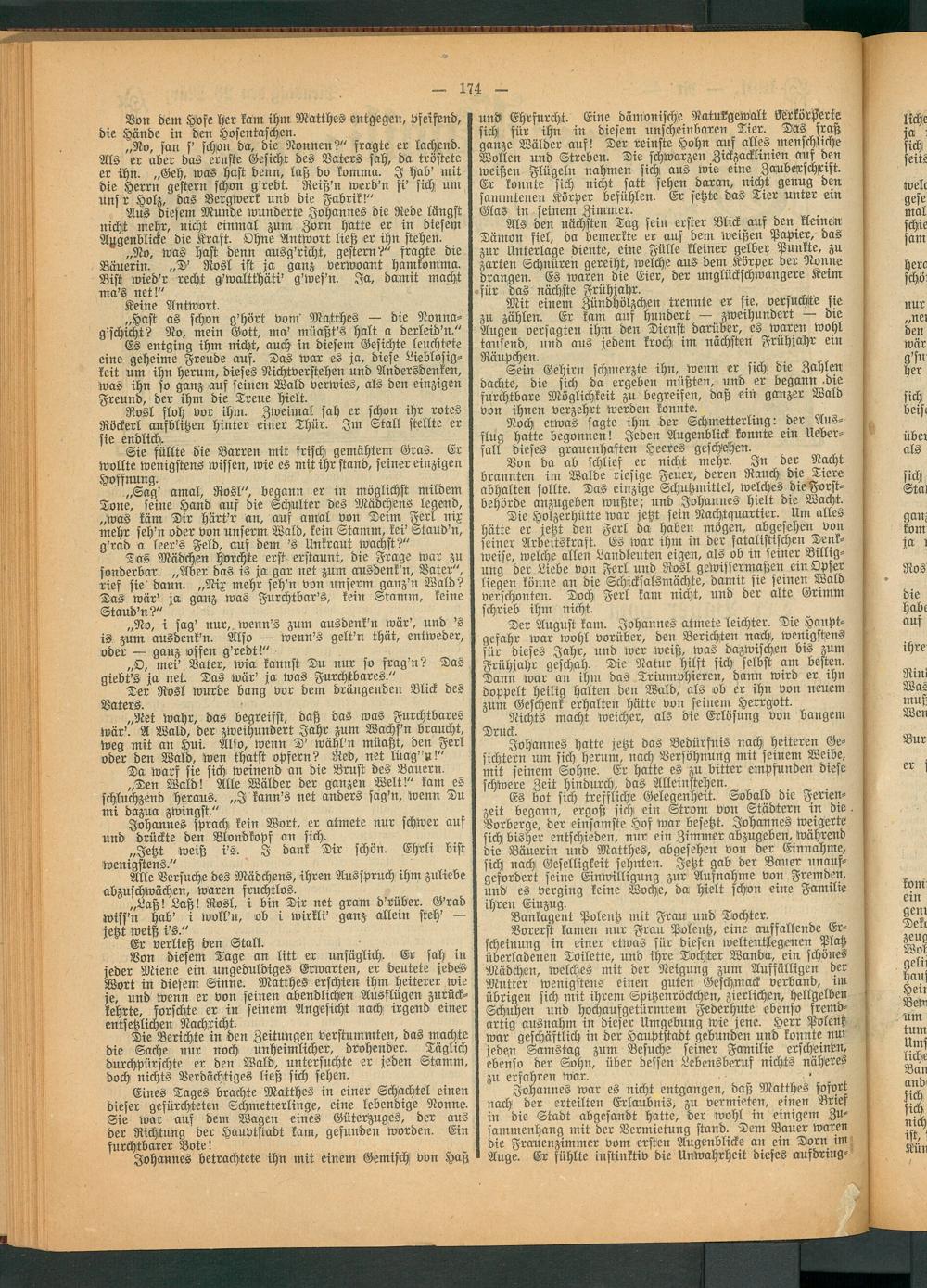Tas Mädchen horchte erst erstaunt, die Frage war zu sonderbar. „Aber das is ja gar net zum ausdenk’n, Vater", rief sie' dann. „Nix mehr seh'n von unserm ganz'n Wald? Tas wär' ja ganz was Furchtbar's, kein Stamm, keine Staud’n?"