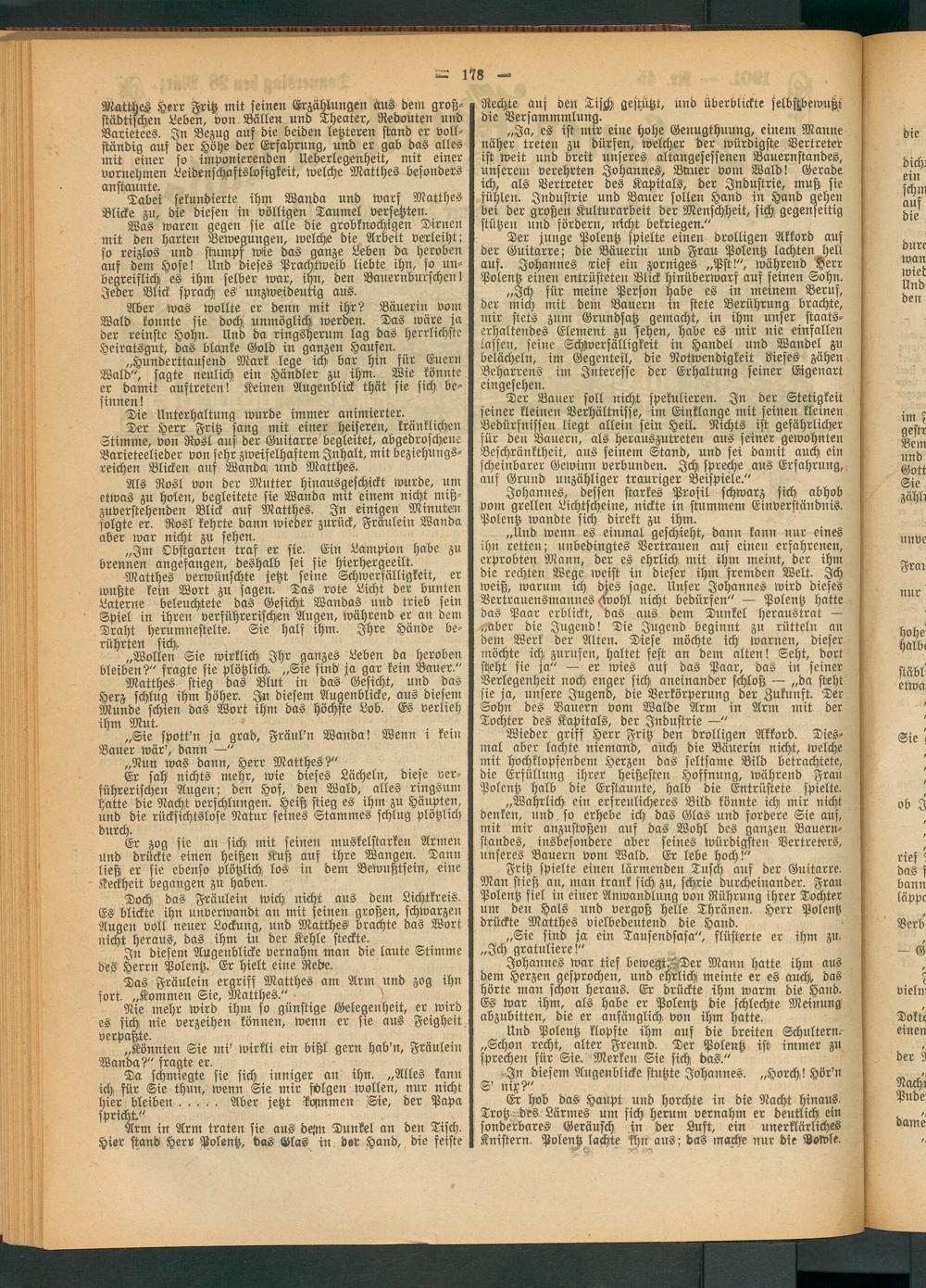 „Ja, es ist mir eilte hohe Genugthuung, einem Manne näher treten zu dürfen, welcher der würdigste Vertreter ist weit und breit unseres altangesessenen Bauernstandes, unserem verehrten Johannes, Bauer vom Wald! Gerade ich, als Vertreter des Kapitals, der Industrie, muß sie fühlen. Industrie und Bauer sollen Hand in Hand gehen bei der großen Kulturarbeit der Menschheit, sich; gegenseitig stützen und fördern, nicht bekriegen."