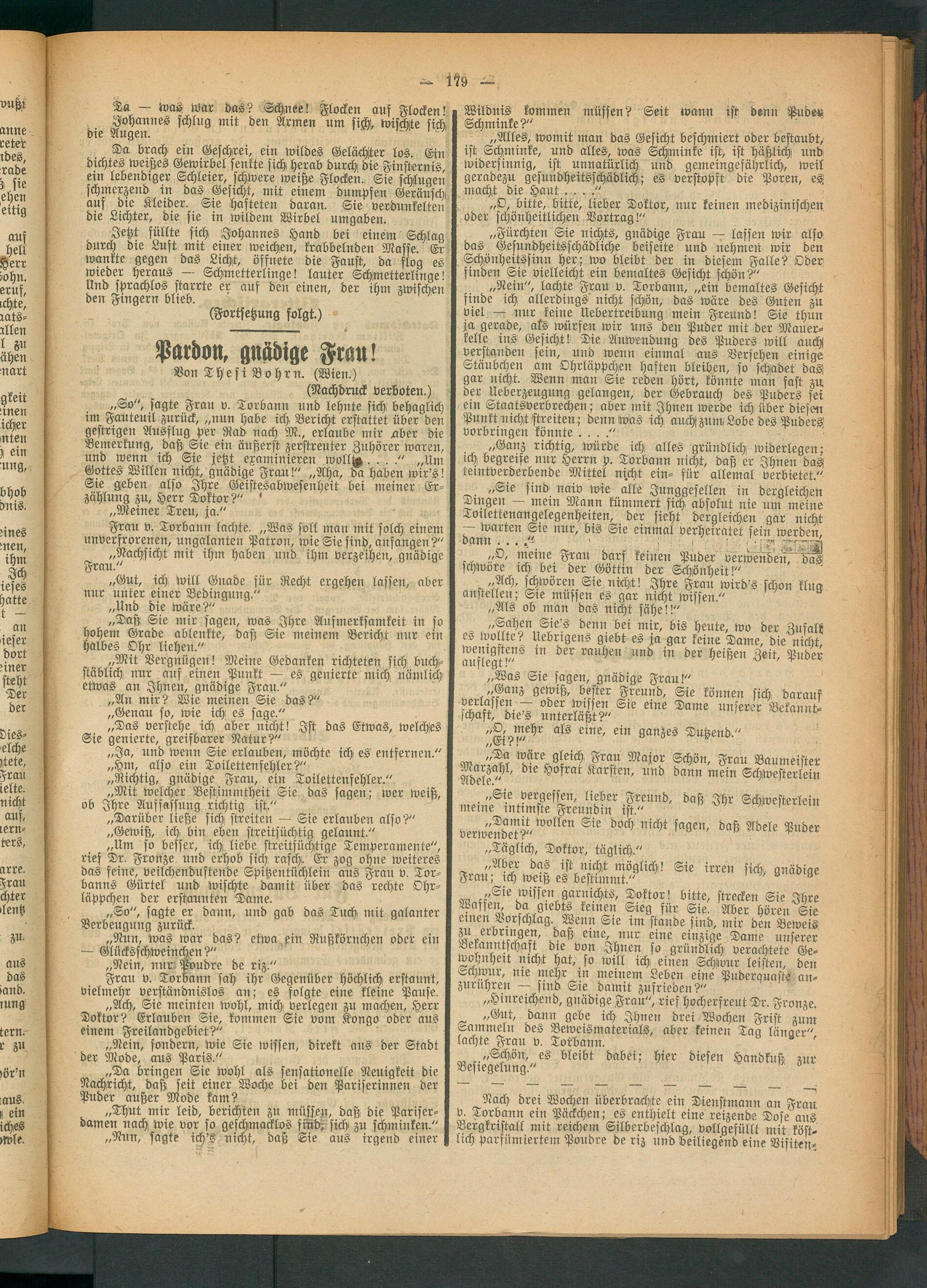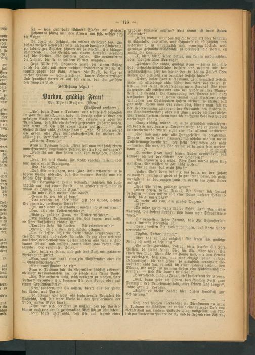 „So", sagte Frau v. Torbann und lehnte sich behaglich im Fauteuil zurück, „nun habe ich Bericht erstattet übenden gestrigen Ausflug per Rad nach M., erlaube mir über die Bemerkung, daß Sie ein äußerst zerstreuter Zuhörer waren, und wenn ich Sie jetzt examinieren wollG. . . ." „Um Gottes Willen nicht, gnädige Frau!" „Aha, da haben wir's! Sie geben also Ihre Geistesabwesenheit bei meiner Erzählung zu, Herr Doktor?" '