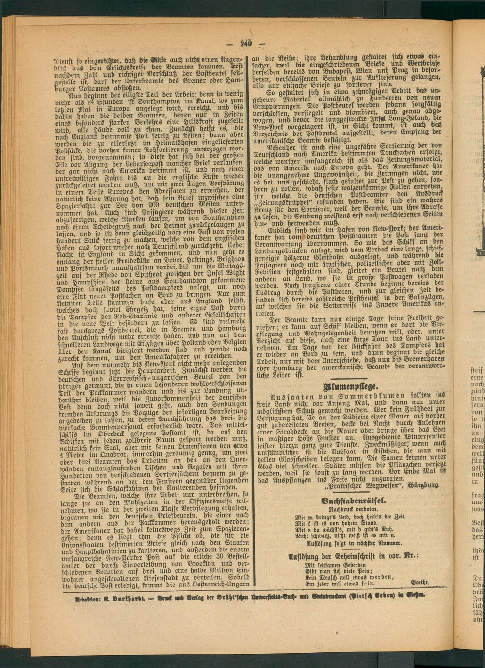 Die Beamten, welche ihre Arbeit nur unterbrechen, so lange sie an den Mahlzeiten in der Offiziersmesse teilnehmen, wo sie in der zweiten Klasse Verpflegung erhalten, beginnen mit den deutschen Briefbeuteln, die einer nach dem andern aus der Packkammer herausgeholt werden; der Amerikaner hat dabei keineswegs Zeit zum Spazierengehen; denn es liegt ihm die Pflicht ob, die für die llnionsstaaten bestimmten Briefe gleich nach den Staaten und Hauptbahnlinien zu kartieren, und außerdem die enorm umfangreiche New-Yorker Post auf die etliche 30 Bestell- ümter der durch Einverleibung von Brooklyn und verschiedenen Vororten auf drei und eine halbe Million Einwohner angeschwollenen Riesenstadt zu verteilen. Sobald die deutsche Post erledigt, kommt die aus Oesterreich-Ungarn