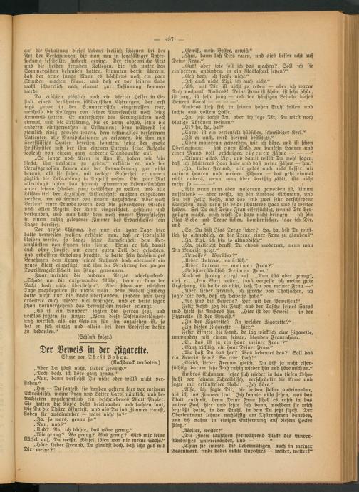 „Also, ich sagte Dir, die beiden stoben auseinander, als ich ins Zimmer trat. Ich konnte nicht sehen, was das Blatt enthielt, denn Deine' Frau schob es rasch in das untere Fach hier und setzte sich dann, nachdem sie mich begrüßt hatte, in den Stuhl, in dem Du jetzt sitzest. Der Oberleutnant lehnte nachlässig am Thürrahmen daneben, und ich nahm in einiger Entfernung auf diesem Hocker Platz."