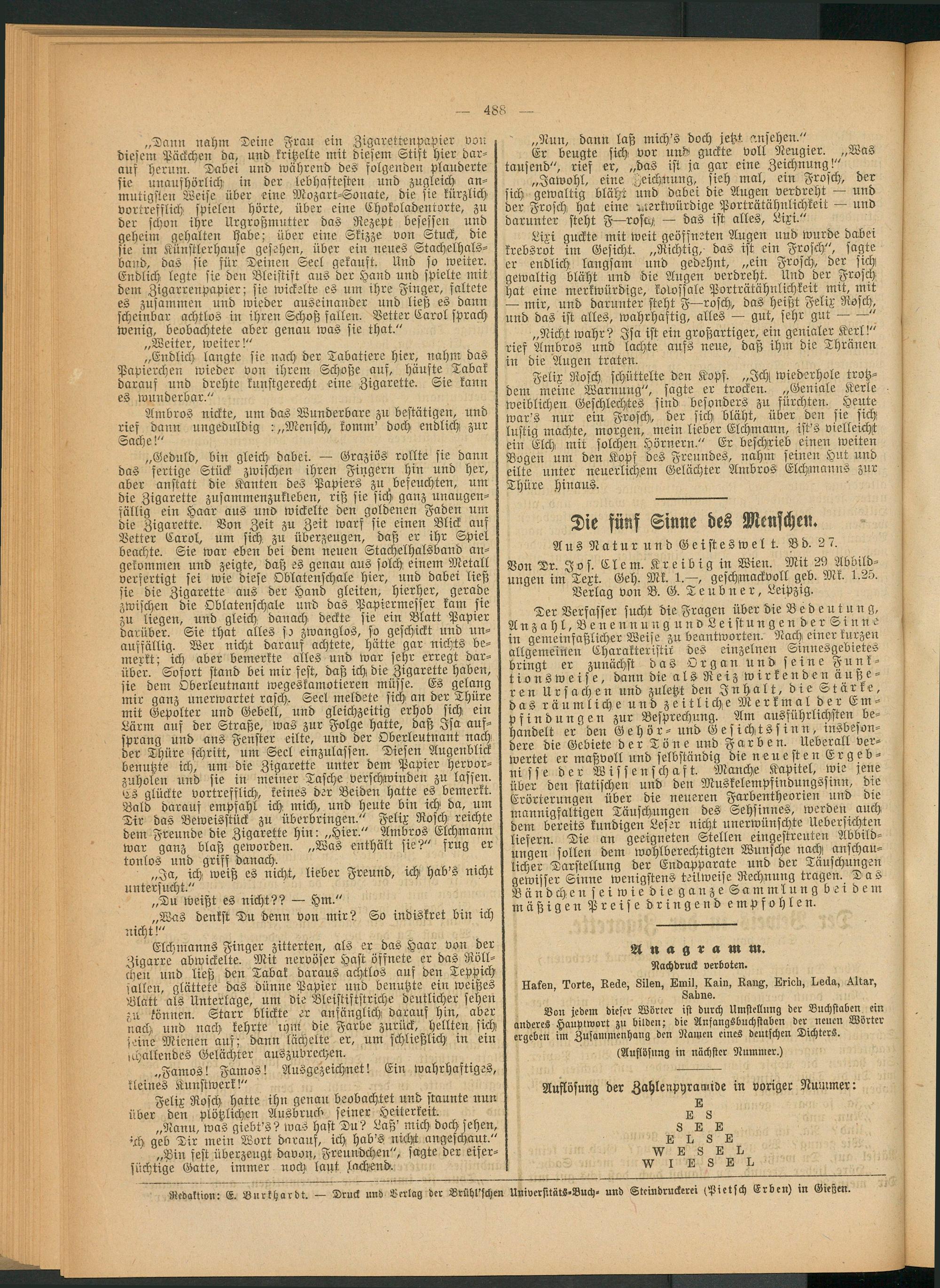 Redaktion: E. Burkhardt. — Druck und Verlag der Brühl'schen Universitäts-Buch- und Steindruckerei (Pietsch Erben) in Gießen.