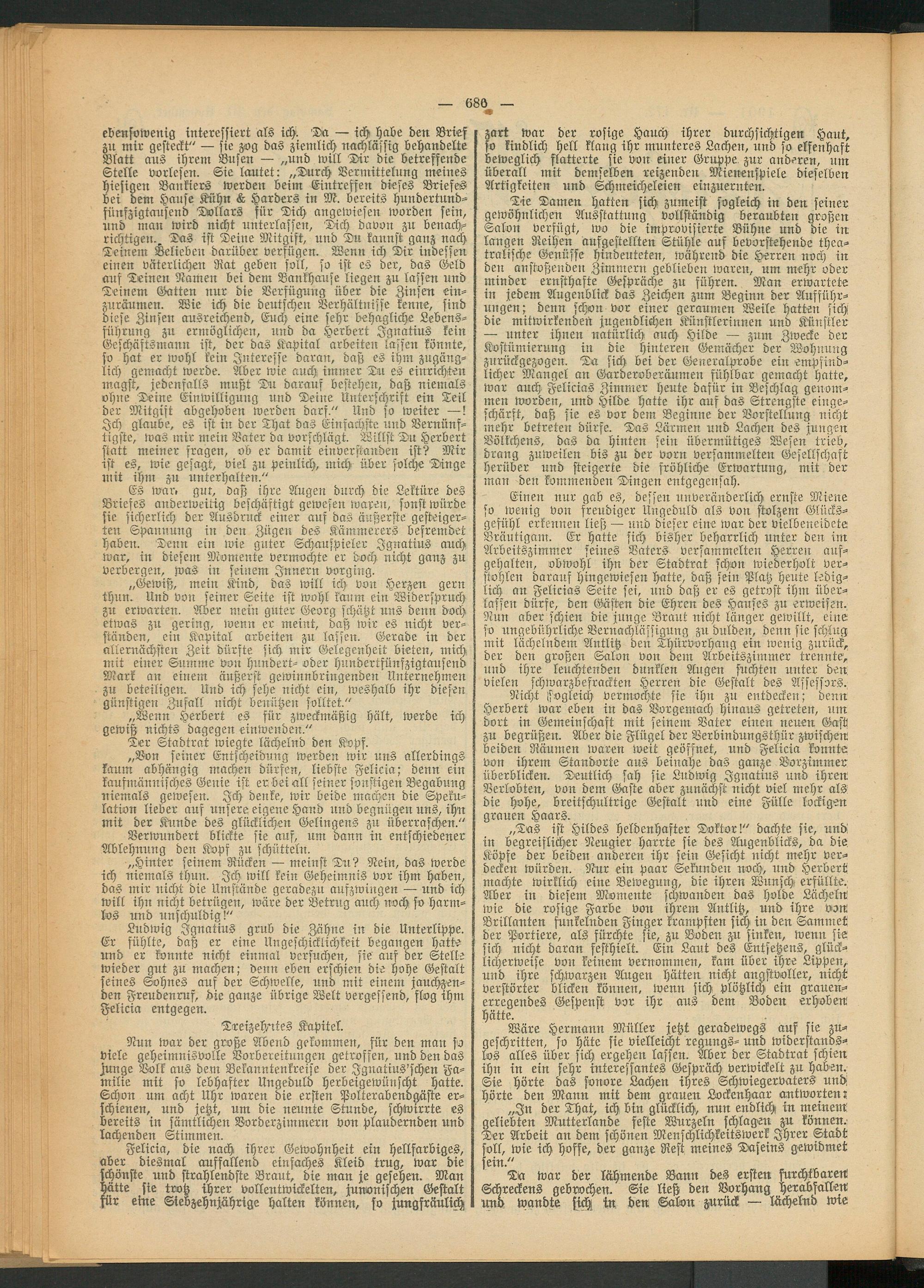 ebensowenig interessiert als ich. Da — ich habe den Brief zu mir gesteckt" — sie zog das ziemlich nachlässig behandelte Blatt ans ihrem Busen — „und will Dir die betreffende Stelle vorlesen. Sie lautet: „Durch Vermittelung meines hiesigen Bankiers werden beim Eintreffen dieses Briefes Lei dem Hause Kühn & Harders in M. bereits hundertund- fünfzigtausend Dollars für Dich angewiesen worden fein, und man wird nicht unterlassen, Dich davon zu benachrichtigen., Das ist Deine Mitgift, und Du kannst ganz nach Deinem belieben darüber verfügen. Wenn ich Dir indessen einen väterlichen Rat geben soll, so ist es der, das Geld auf Deinen Namen bei dem Bankhause liegen zu lassen und Deinem Gatten nur die Verfügung über die Zinsen einzuräumen. Wie ich die deutschen Verhältnisse kenne, sind diese Zinsen ausreichend, Euch eine sehr behagliche Lebensführung zu ermöglichen, und da Herbert Ignatius kein Geschäftsmann ist, der das Kapital arbeiten lassen könnte, so hat er wohl kein Interesse daran, daß es ihm zugänglich gemacht werde. Aber wie auch immer Du es einrichten magst, jedenfalls mußt Du darauf bestehen, daß niemals ohne Deine Einwilligung und Deine Unterschrift ein Teil der Mitgift abgehoben werden darf." Und so weiter —! Ich glaube, es ist in der That das Einfachste und Vernünftigste, was mir mein Vater da vorschlägt. Willst Du Herbert statt meiner fragen, ob er damit einverstanden ist? Mir ist es, wie gesagt, viel zu peinlich, mich über solche Dinge mit ihm zu unterhalten."
