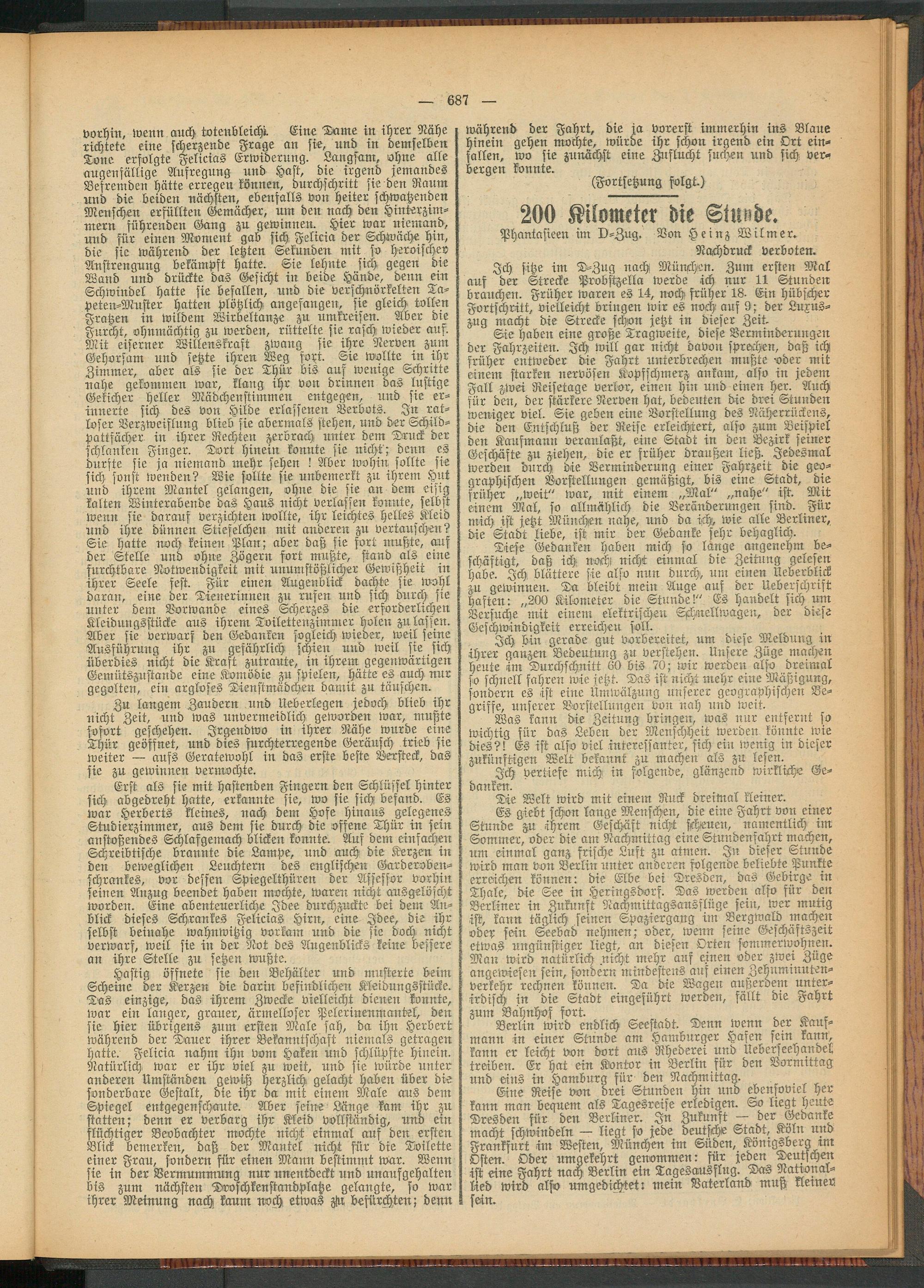 Tiefe Gedanken haben mich so lange angenehm beschäftigt, daß ich noch nicht einmal die Zeitung gelesen habe. Ich blättere sie also nun durch, um einen, Ueberblick zu gewinnen. Da bleibt mein Auge auf der Ueberschrift haften: „200 Kilometer die Stunde!" Es handelt sich um Versuche mit einem elektrischen Schnellwagen, der diese Geschwindigkeit erreichen, soll.