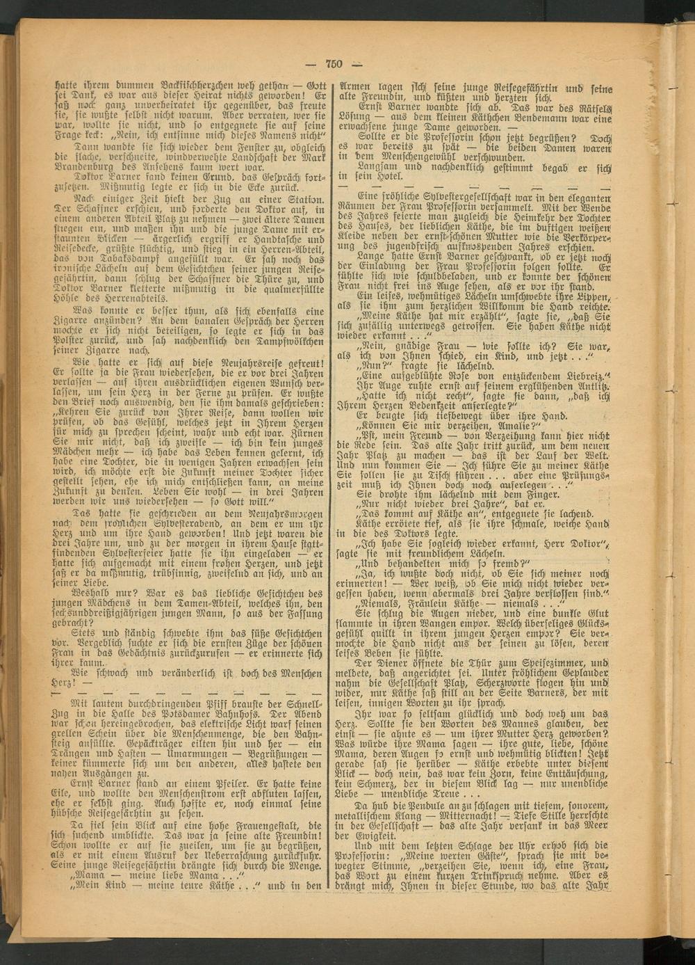 Eine fröhliche Sylvestergesellschaft war in den eleganten Räumen der Frau Professorin versammelt. Mit der Wende des Jahres feierte man zugleich die Heimkehr der Tochter des Hauses, der lieblichen Käthe, die im duftigen weißen Kleide neben der ernst>schönen Mutter wie die Verkörperung des jugendfrisch aufknospenden Jahres erschien.