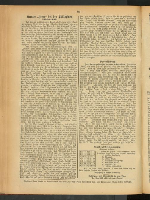 Auf Grund authentischer Tagebuch-Notizen gießt Kapitänleutnant Pohl jetzt in der „Marine-Rundschau" eine anschauliche Schilderung der Thätigkeit des Kreuzers „Irene" in den Gewässcrir der Philippinen 1896 bis 1899 bekannt. Es ist während des Aufenthaltes der deutschen Kriegsschiffe in den philippinischen Gewässern so viel Unrichtiges über ihre damalige Zweckbestimmung und Thätigkeit seitens der ausländischen Presse in die Welt gesetzt worden, heißt es in jenem Artikel, daß es sich Wohl lohnt, die Thätigkeit des am meisten angefeindeten Schiffes „Irene" zu schildern und durch einfache Erzählung ihres Wirkens die Grundlosigkeit dieser Nachrichten nachzuweisen.