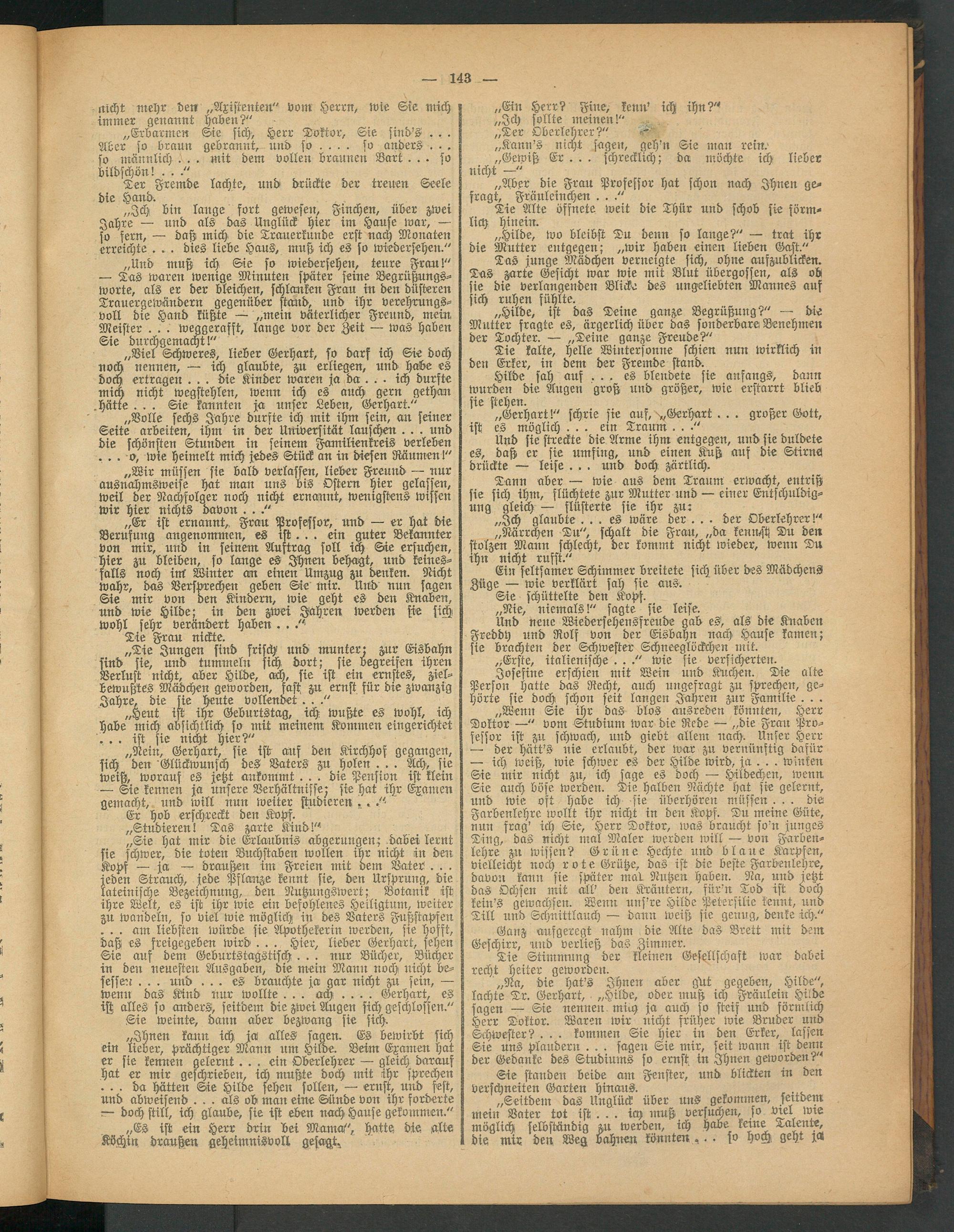 „Er ist ernannt, Frau Professor, und — er hat die Berufung angenommen, es ist. . . ein guter Bekannter von mir, und in seinem Auftrag soll ich Sie ersuchen, hier zu bleiben, so lange es Ihnen behagt, und keinesfalls noch im Winter an einen Umzug zu denken. Nicht wahr, das Versprechen geben Sie mir. Und nun sagen Sie mir von den Kindern, wie geht es den Knaben, und wie Hilde; in den zwei Jahren werden sie sich wohl sehr verändert haben. .