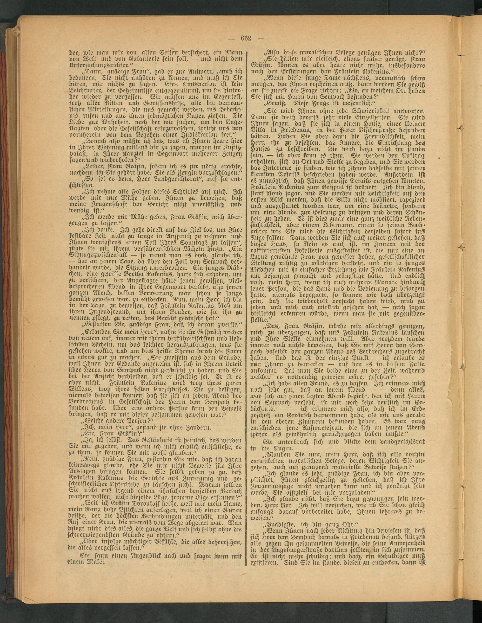 „Wenn diese junge Tame nächstens, vermutlich schon morgen, vor Ihnen erscheinen muß, daun werden Sie gewiß an sie zuerst die Frage richten: „Wo, an welchem Ort haben Sie sich mit Herrn von Sempach befunden?"