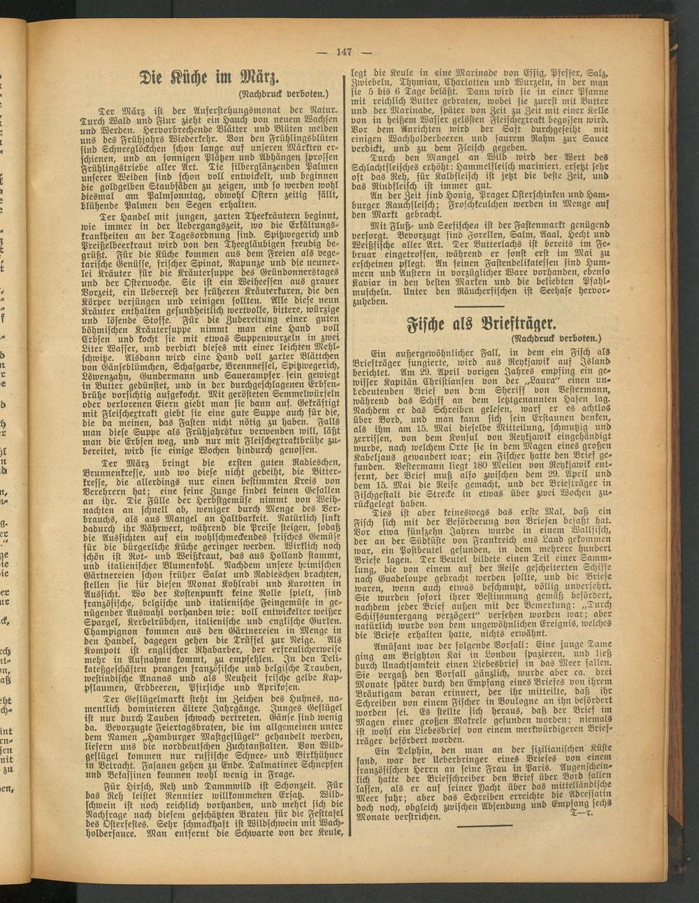 Amüsant war der folgende Vorfall: Eine junge Dame ging am Brighton Kai in London spazieren, und ließ durch Unachtsamkeit einen Liebesbrief in das Meer fallen. Sie vergaß den Vorfall gänzlich, wurde aber ca. dret Monate später durch den Empfang eines Briefes von ihrem Bräutigam daran erinnert, der ihr mitteilte, daß ihr Schreiben von einem Fischer in Boulogne an ihn befördert worden sei. Es stellte sich heraus, daß der Brief int Magen einer großen Makrele gefunden worden; niemals ist wohl ein Liebesbrief von einem merkwürdigeren Briefträger befördert worden.