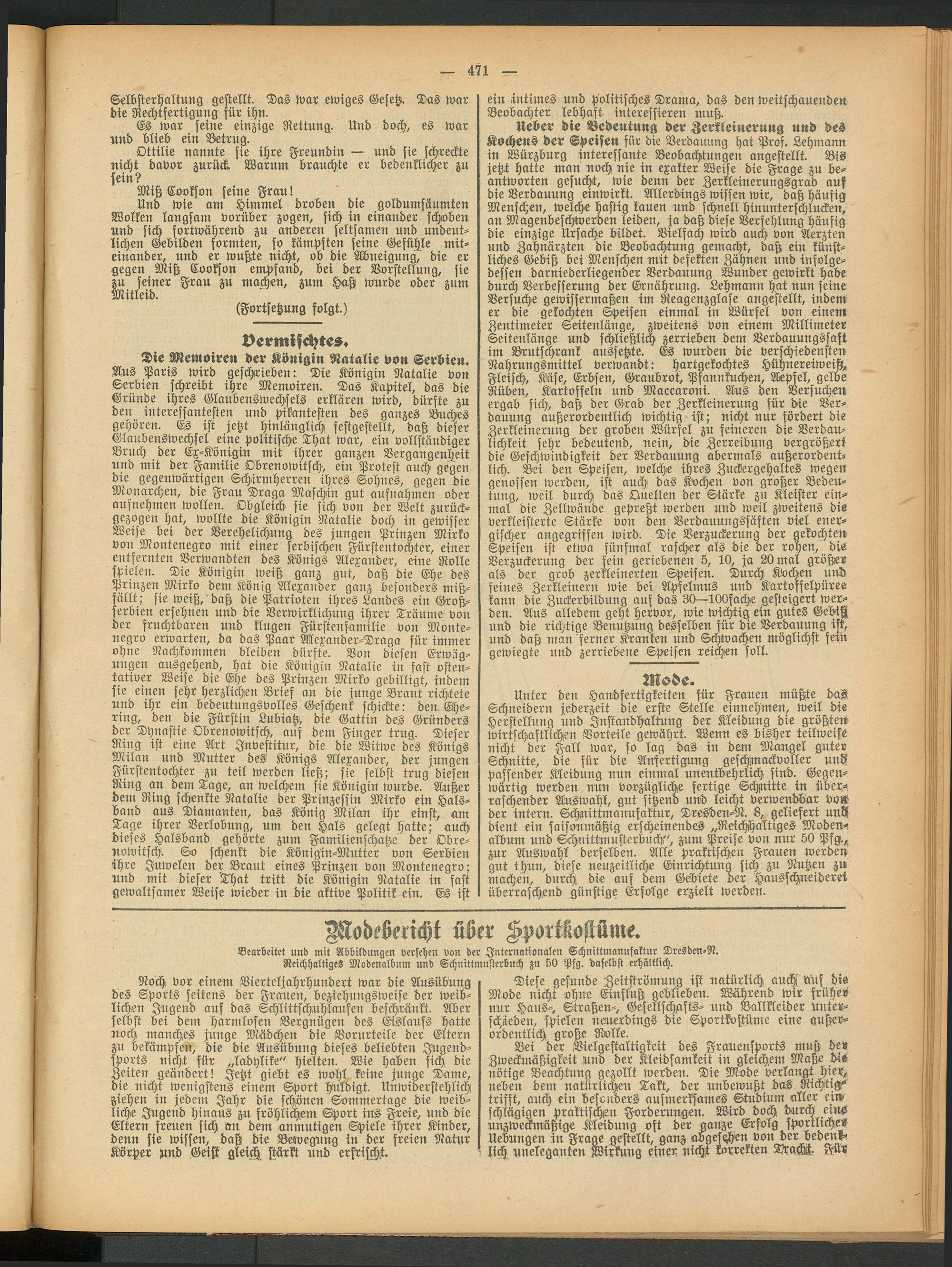 Die Memoiren der Königin Natalie von Serbien. Aus Paris wird geschrieben: Die Königin Natalie von Serbien schreibt ihre Memoiren. Das Kapitel, das die Gründe ihres Glaubenswcchsels erklären wird, dürfte zu den interessantesten und pikantesten des ganzes Buches gehören. Es ist jetzt hinlänglich festgestellt, daß dieser Glaubenswechsel eine politische That war, ein vollständiger Bruch der Ex-Königin mit ihrer ganzen Vergangenheit und mit der Familie Obrenowitsch, ein Protest auch gegen die gegenwärtigen Schirmherren ihres Sohnes, gegen die Monarchen, die Frau Draga Maschin gut aufnahmen oder aufnehmen wollen. Obgleich sie sich von der Welt zurückgezogen hat, wollte die Königin Natalie doch in gewisser Weise bei der Verehelichung des jungen Prinzen Mirko von Montenegro mit einer serbischen Fürstentochter, einer entfernten Verwandten des Königs Alexander, eine Rolle spielen. Die Königin weiß ganz gut, daß die Ehe des Prinzen Mirko dem König Alexander ganz besonders mißfällt; sie weiß, daß die Patrioten ihres Landes ein Großserbien ersehnen und die Verwirklichung ihrer Träume von der fruchtbaren und klugen Fürstenfamilie von Montenegro erwarten, da das Paar Mcxander-Draga für immer ohne Nachkommen bleiben dürfte. Von diesen Erwägungen ausgehend, hat die Königin Natalie in fast ostentativer Weise die Ehe des Prinzen Mirko gebilligt, indem sie einen sehr herzlichen Brief an die junge Braut richtete und ihr ein bedeutungsvolles Geschenk schickte: den. Ehering, den die Fürstin Lubiatz, die Gattin des Gründers der Dynastie Obrenowitsch, auf dem Finger trug. Dieser Ring ist eine Art Investitur, die die Witwe des Königs Milan und Mutter des Königs Alexander, der jungen Fürstentochter zu teil werden ließ; sie selbst trug diesen Ring an dem Tage, an welchem sie Königin wurde. Außer dem Ring schenkte Natalie der Prinzessin Mirko ein Halsband aus Diamanten, das König Milan ihr einst, am Tage ihrer Verlobung, um den Hals gelegt hätte; auch dieses Halsband gehörte zum Familienschatze der Obre- nowitsch. So schenkt die Königin-Mutter von Serbien ihre Juwelen der Braut eines Prinzen von Montenegro; und mit dieser "That tritt die Königin Natalie in fast gewaltsamer Weise wieder in die aktive Politik ein. Es ist