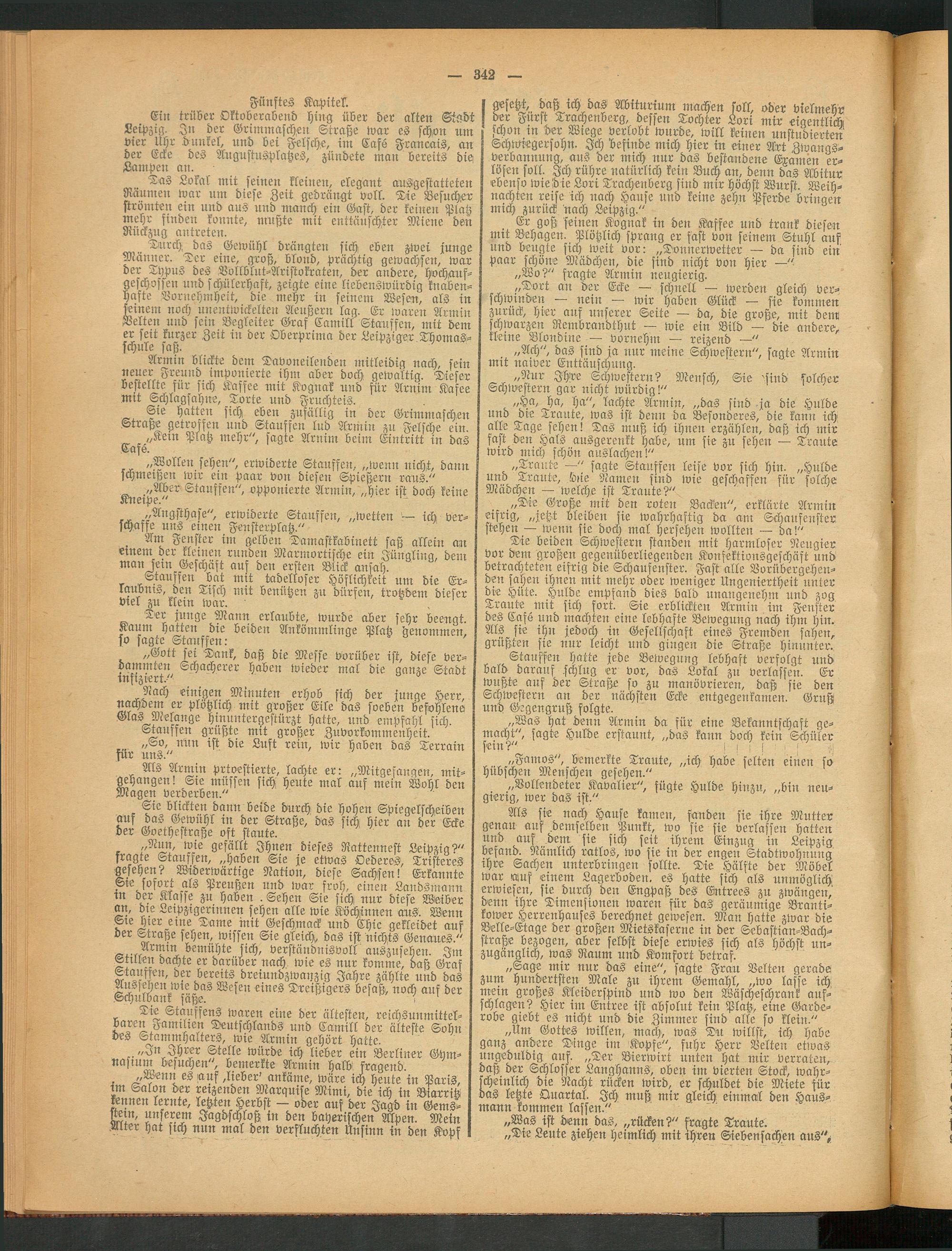 Die beiden Schwestern standen mit harmloser Neugier vor dem großen gegenüberliegenden Konfektionsgeschäft und betrachteten eifrig die Schaufenster. Fast alle Vorübergehenden sahen ihnen mit mehr oder weniger Ungeniertheit unter die Hüte. Hulde empfand dies bald unangenehm und zog Traute mit sich fort. Sie erblickten Armin im Fenster des Cast und machten eine lebhafte Bewegung nach ihm hin. Als sie ihn jedoch kn Gesellschaft eines Fremden sahen, grüßten sie nur leicht und gingen die Straße hinunter.