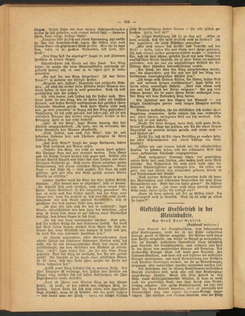 In seinem ungerechten, alles überwuchernden Zorn achtete Justus des sichtbaren Schmerzes Marias nicht, sah nicht, wie sie mit übermenschlicher Kraft das eigene Leid zurückdrängte, um dem Geliebten den Abschied zu erleichtern. „Geh'", sagte dieser kalt, „da Du mir keine Treue gehalten. Aber der Ring sei verflucht, den Du mir zurück- giebst! Nie schmücke er die Hand einer glücklichen Braut, es sei denn, daß ihre Liebe schon vorher die Probe der Treue bestanden hat."