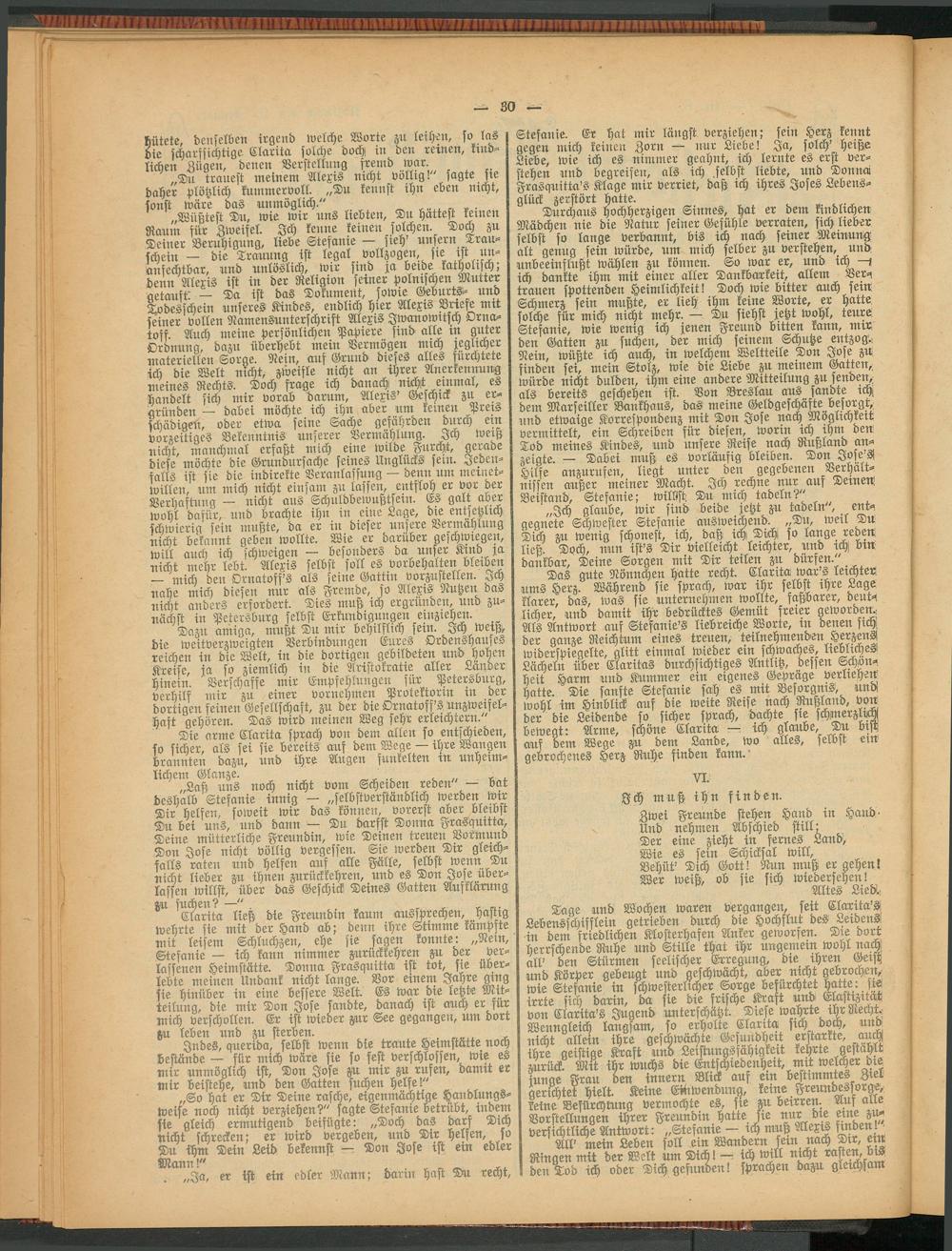 Tage und Wochen waren vergangen, seit Clarila'H Lebensschifflein getrieben durch die Hochflut des Leidens! in dem friedlichen Klosterhafen Anker geworfen. Die dort herrschende Ruhe und Stille that ihr ungemein wohl nach all' bett Stürmen seelischer Erregung, die ihren Geist und Körper gebeugt und geschwächt, aber nicht gebrochen, wie Stefanie in schwesterlicher Sorge befurchtet hatte: sie irrte sich darin, ba sie die frische Kraft und Elastizuat vou Clarila's Jugend unterschätzt. Diese wahrte ihr Recht.- Wenngleich langsam, so erholte Clarita sich doch, und nicht allein ihre geschwächte Gesundheit erstarkte, auch ihre geistige Kraft und Leistungsfähigkeit kehrte gestählt zurück Mit ihr wuchs die Entschiedenheit, mit welcher dm junge Frau den innern Blick auf etn bestimmtes Ziel gerichtet hielt. Keine Emwendung, keine Freundessorge, keine Befürchtung vermochte es, sie zu beirren. Aus alle Vorstellungen ihrer Freundin hatte fle nur die eme zuversichtliche Antwort: „Stefanie — ich muß Alexis finden.