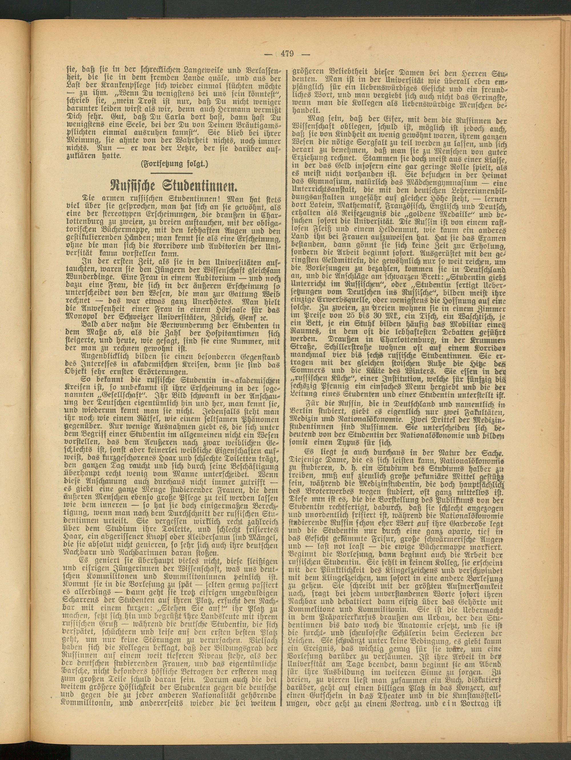 So bekannt die russische Studentin in akademischen Kreisen ist, so unbekannt ist ihre Erscheinung in der sogenannten „Gesellschaft". Ihr Bild schwankt in der Anschauung der Deutschen eigentümlich hin und her, man kennt sie, und wiederum kennt man sie nicht. Jedenfalls steht man ihr noch wie einem Rätsel, wie einem seltsamen Phänomen gegenüber. Nur wenige Ausnahmen giebt es, die sich unter dem Begriff einer Studentin im allgemeinen nicht ein Wesen vorstellen, das dem Aeußeren nach zwar werblichen Geschlechts ist, sonst aber keinerlei weibliche Eigenschaften aufweist, das kurzgeschorenes Haar und schlechte Toiletten trägt, den ganzen Tag raucht und sich durch seine Beschäftigung überhaupt recht wenig vom Manne unterscheidet. Wenn diese Anschauung auch durchaus nicht immer zutrifft — es giebt eine ganze Menge studierender Frauen, die dem äußeren Menschen ebenso große Pflege zu teil werden lassen wie dem inneren — so hat sie doch einigermaßen Berechtigung, wenn man nachdem Durchschnitt der russischen Studentinnen urteilt. Sie vergessen wirklich recht zahlreich über dem Studium ihre Toilette, und schlecht frisiertes! Haar, ein abgerissener Knops oder Kleidersaum sind Mängel, die sie absolut nicht genieren, so sehr sich auch ihre deutschen Nachbarn und Nachbarinnen daran stoßen.