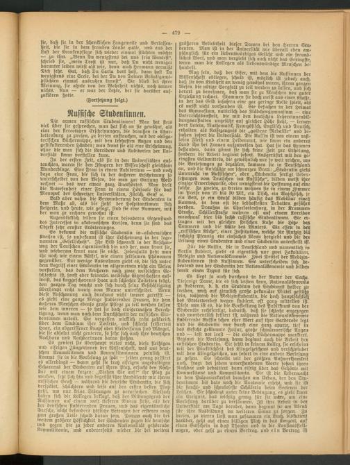 Es geniert sie überhaupt vieles nicht, diese fleißigen und eifrigen Jüngerinnen der Wissenschaft, was uns deutschen Kommilitonen und Kvmmilitoninnen peinlich ist. Kommt sie in die Vorlesung zu spät — selten genug passiert es allerdings — dann geht sie trotz eifrigen ungeduldigen Scharrens der Studenten auf ihren Platz, ersucht den Nachbar mit einem kurzen: „Stehen Sie auf!" ihr Platz zu machen, setzt sich hin und begrüßt ihre Landsleute mit ihrem russischen Gruß — während die deutsche Studentin, die sich verspätet, schüchtern und leise auf den ersten besten Platz geht, um nur keine Störungen zu verursachen. Vielfach haben sich die Kollegen beklagt, daß der Bildungsgrad der Russinnen auf einem weit tieferen Niveau stehe, als der der deutschen studierenden Frauen, und das eigentümliche "barsche, nicht besonders höfliche Betragen der ersteren mag zum großen Teile schuld daran sein. Darum auch die bet weitem größere Höflichkeit der Studenten gegen die deutsche Und gegen die zu jeder anderen Nationalität gehörende Kommilitonin, und andererseits wieder die bei weitem