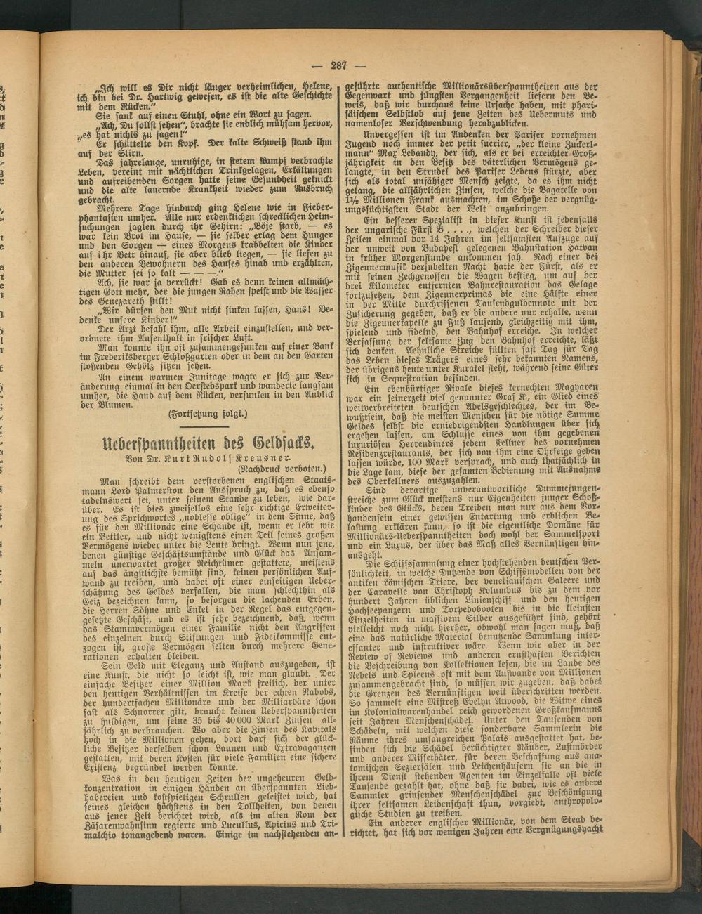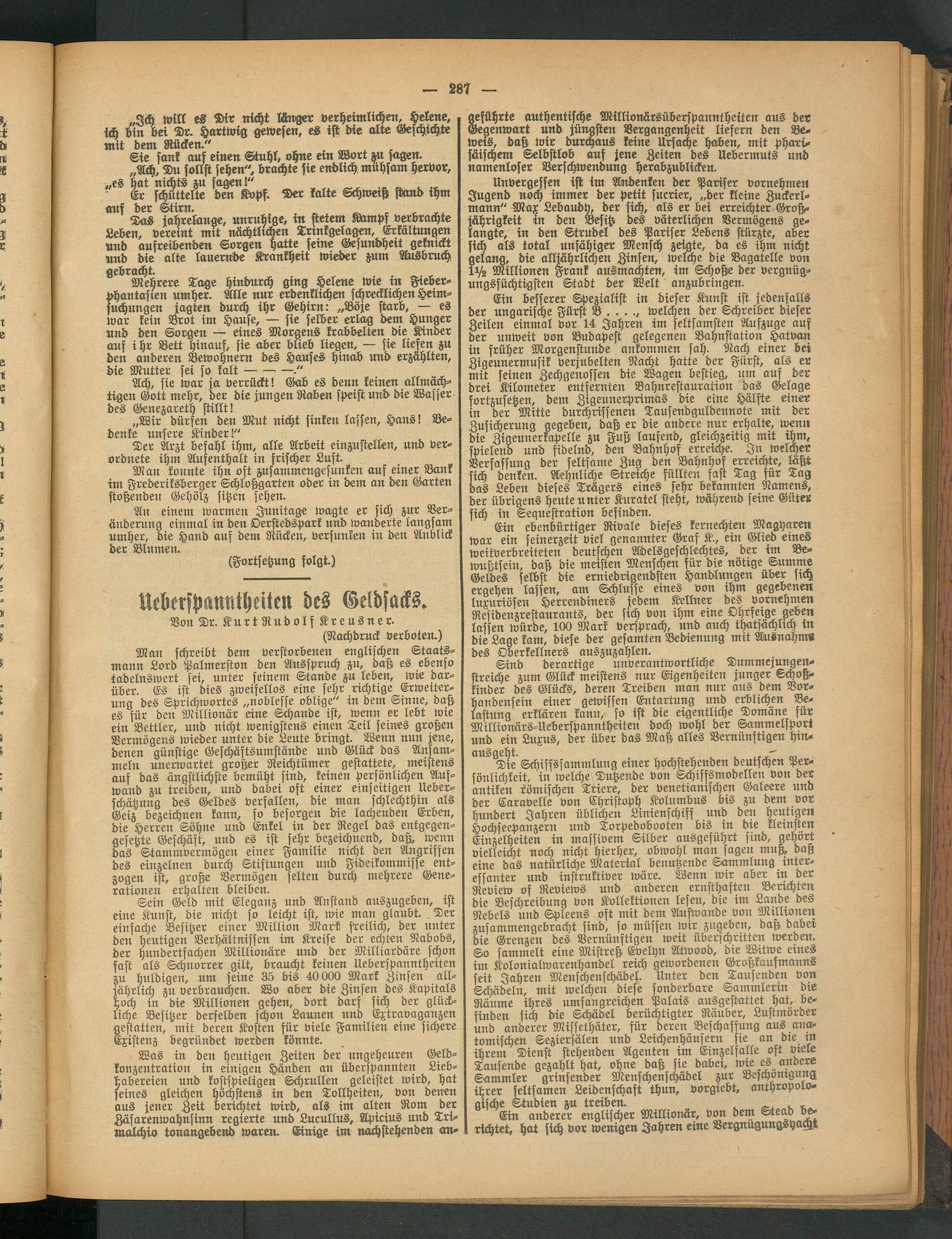 Ein ebenbürtiger Rivale dieses kernechten Magyaren war ein seinerzeit viel genannter Graf K., ein Glied eines weitverbreiteten deutschen Adelsgeschlechtes, der im Bewußtsein, daß die meisten Menschen für die nötige Summe Geldes selbst die erniedrigendsten Handlungen über sich ergehen lassen, am Schlüsse eines von ihm gegebenen luxuriösen tzerrendiners jedem Kellner des vornehmen Residenzrestaurants, der stch von ihm eine Ohrseige geben lassen würde, 100 Mark versprach, und auch thatsachltch in die Lage kam, diese der gesamten Bedienung mit Ausnahm« des Oberkellners auszuzahlen.