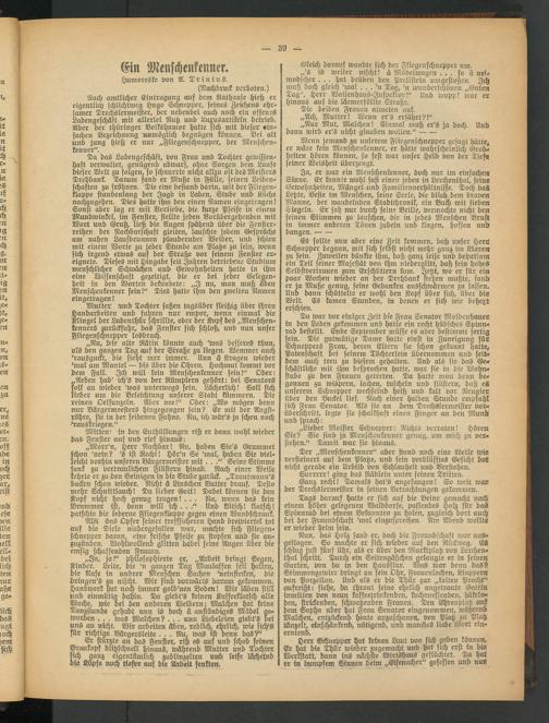 Nun, das Hotz fand er, doch die Freundschaft war ausgeflogen. So machte er sich wieder auf den Rückweg. Es schlug just Mrs Uhr, als er über den Marktplatz von Lerchenthal schritt. Durch ein Seitengäßchen gelangte er in seinen Garten, von da in den Hausflur. Was war denn das!? Stimmengewirr dringt an sein Ohr, Frauenlachen, Klappern von Porzellan. Und als er die Thür zur „kältet: Pracht aufrecht: siehe, da thront seine ehelich angetraute Gattin inmitten von neun kaffeetrinkenden, kuchenessenden, häkelnden, strickenden, schwatzenden Frauen. Den Ehrenplatz auf dem Sopha aber hat Frau Senator eingenommen, währens Malchen, entzückend heute anzuschauen, von Platz zu Platz' tänzelt, einschänkend, nötigend, und manches liebe Wort einerntend.