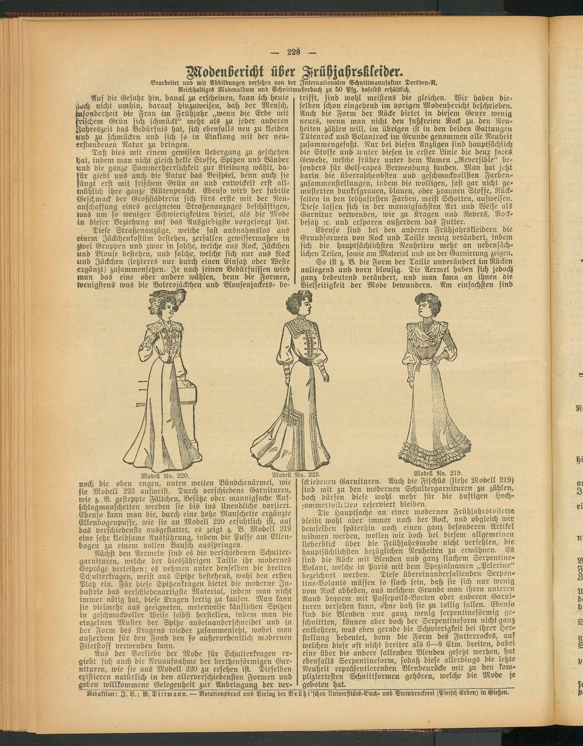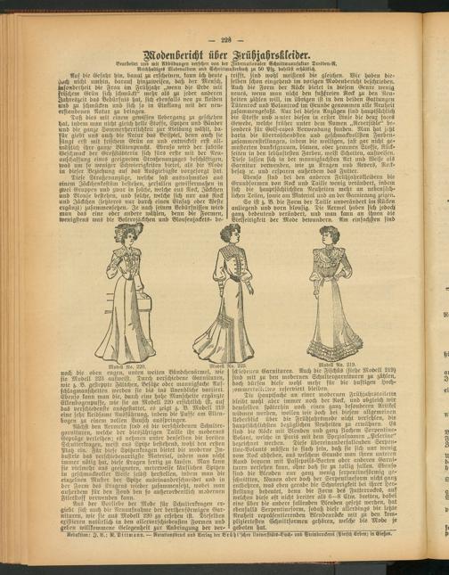 noch die oben engen, unten weiten Bündchenärmel, wie sie Modell 223 aufweist. Durch verschiedene Garnituren, wie z. B. gesteppte Fältchen, Besätze oder mannigfache Aufschlagmanschetten werden sie bis ins Unendliche variiert. Ebenso kann man die, durch eine hohe Manschette ergänzte Ellenbogenpuffe, wie sie an Modell 220 ersichtlich ist, auf das verschiedenste ausgestattet, es zeigtB. Modell 219 eine sehr kleidsame Ausführung, indem die Puffe am Ellen- bogeu zu einem vollen Bausch ausspringen.