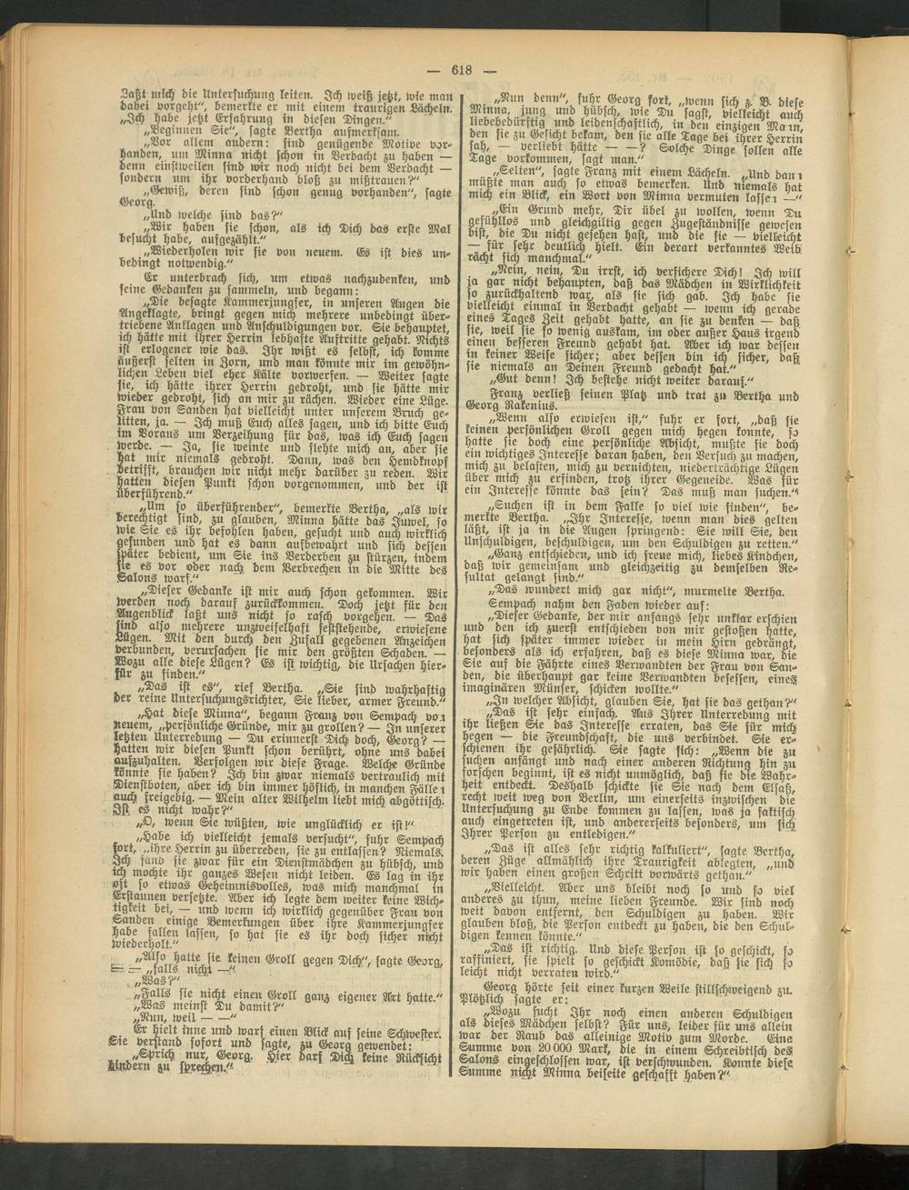 .. »Um so überführender", bemerkte Bertha, „als wir berechtigt sind, zu glauben, Minna hätte das Juwel, so wie Sie es ihr befohlen haben, gesucht und auch wirklich gefunden und hat es dann aufbewahrt und sich dessen Water bedient, um Sie ins Verderben zu stürzen, indem ste es vor oder nach dem Verbrechen in die Mitte des Salons warf."