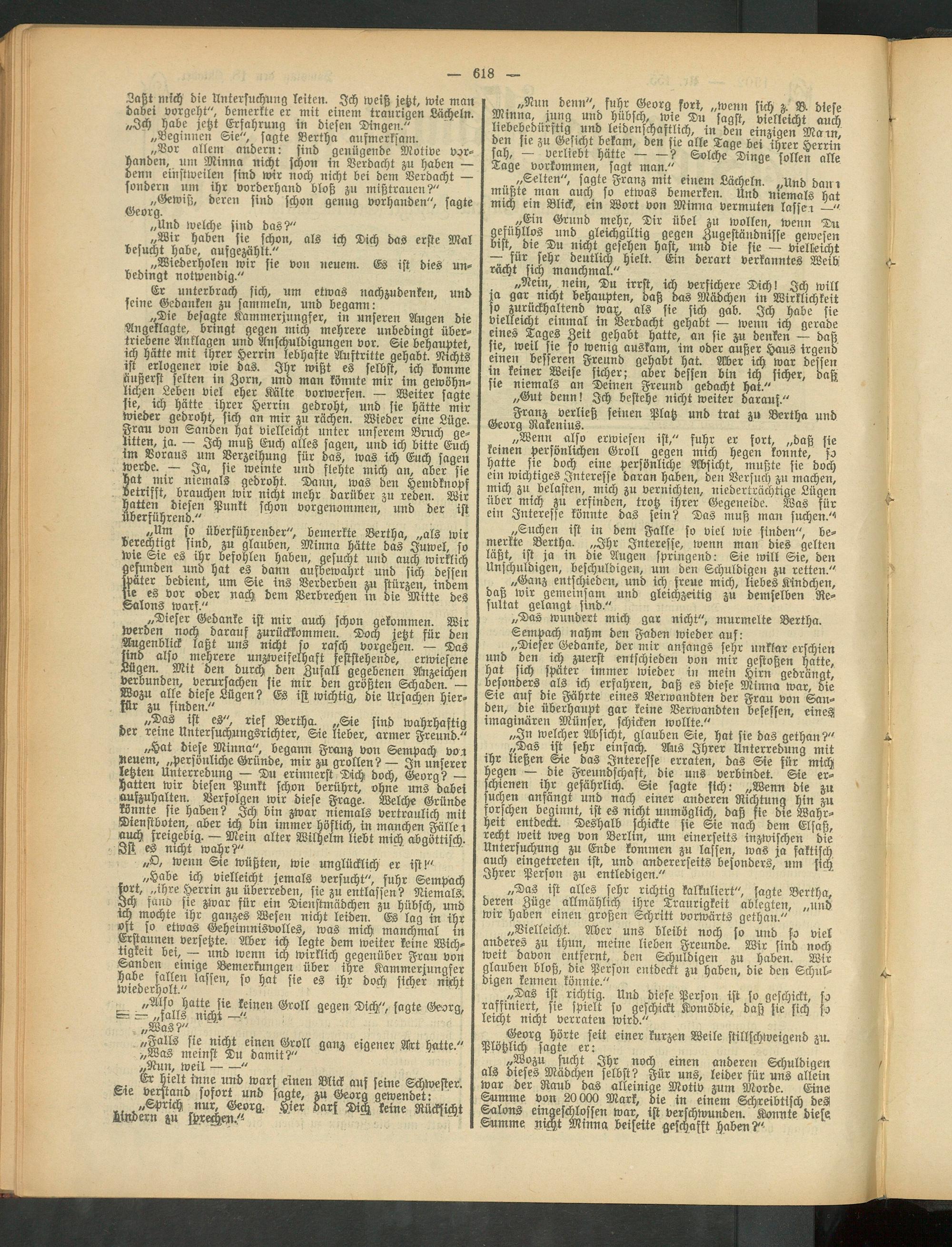 „Suchen ist in dem Falle so viel wie finden", bemerkte Bertha. „Ihr Interesse, wenn man dies gelten läßt, ist ja in die Augen springend: Sie will Sie, den Unschuldigen, beschuldigen, um den Schuldigen zu retten."