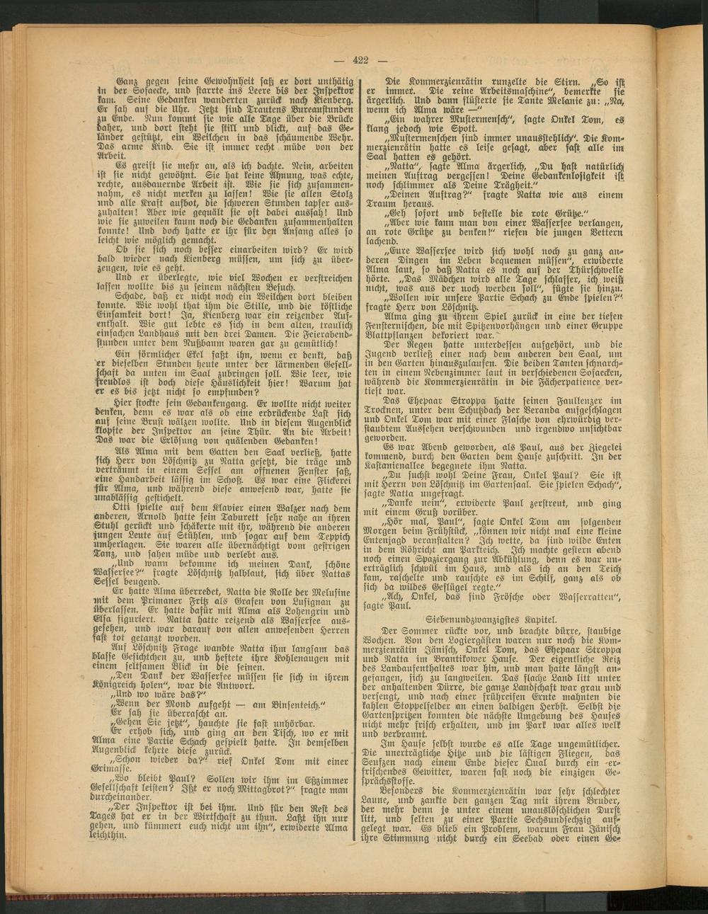 Der Sommer rückte vor, und brachte dürre, staubige Wochen. Von den Logiergästen waren nur noch die Kommerzienrätin Jänisch, Onkel Tom, das Ehepaar Strvppä und Natta im Brantikower Hause. Der eigentliche Reiz des Landaufenthaltes war hin, und man hatte längst angefangen, sich zu langweilen. Das flache Land litt unter der anhaltenden Dürre, die ganze Landschaft war grau und versengt, und nach einer frühreifen Ernte mahnten die kahlen Stoppelfelder an einen baldigen Herbst. Selbst die Gartenspritzen konnten die nächste Umgebung des Hauses nicht mehr frisch erhalten, und jm Park war alles welk und verbrannt.