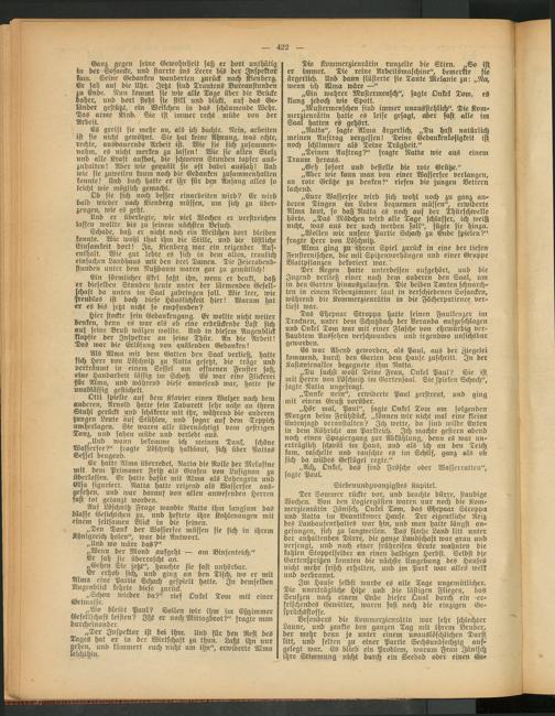 Der Regen hatte unterdessen aufgehört, und die Jugend verließ einer nach dem anderen den Saal, um in den Garten hinauszulaufen. Die beiden Tanten schnarchten in einem Nebenzimmer laut in verschiedenen Sofaecken, während die Kommerzienrätin in die Fächerpatience vertieft war.