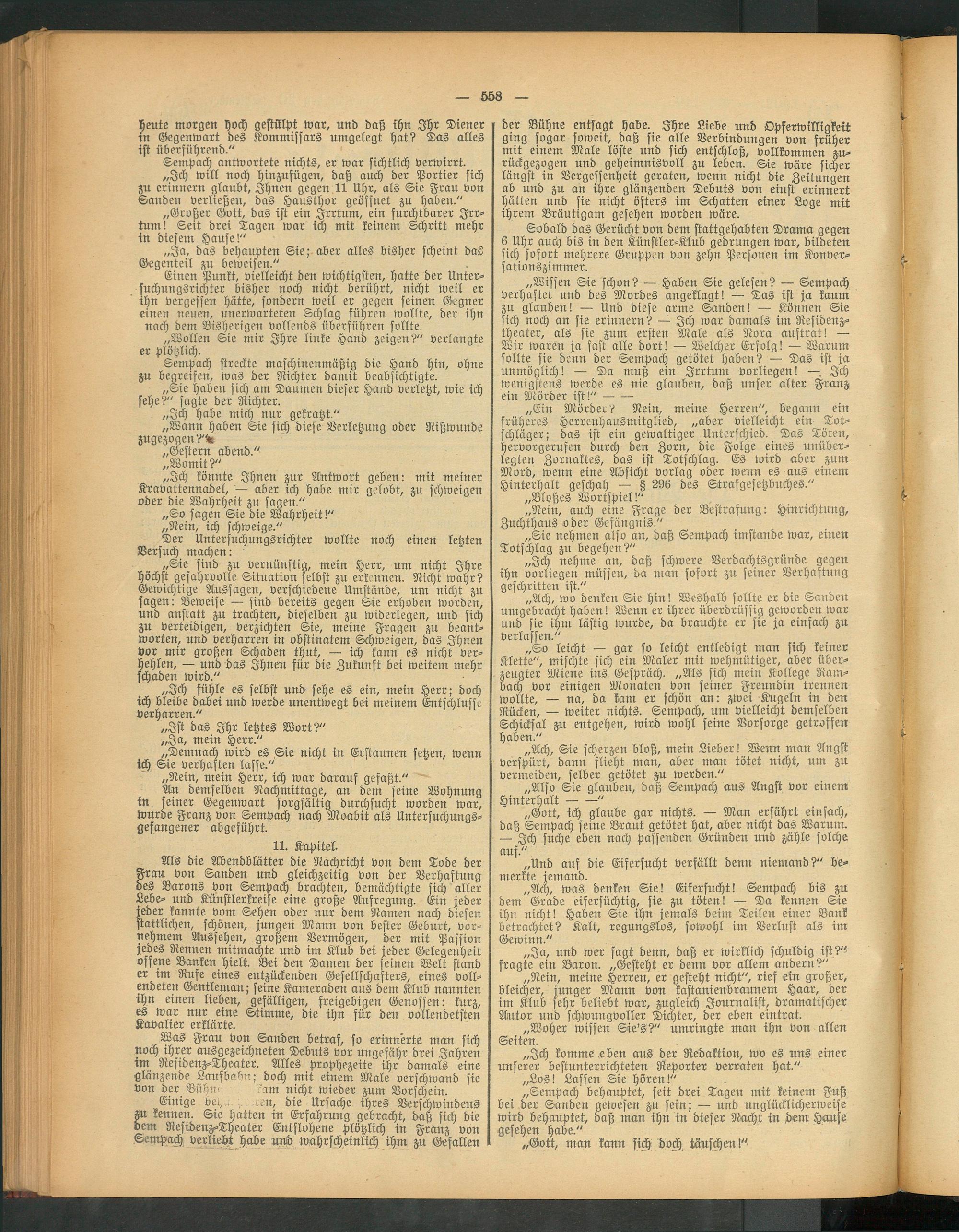 Als die Abendblätter die Nachricht von dem Tode der Frau von Sanden und gleichzeitig von der Verhaftung des Barons von Sempach brachten, bemächtigte sich aller Lebe- und Künstlerkreise eine große Aufregung. Ein jeder jeder kannte vom Sehen oder nur dem Namen nach diesen stattlichen, schönen, jungen Mann von bester Geburt, vornehmem Aussehen, großem Vermögen, der mit Passion jedes Rennen mitmachte und im Klub bei jeder Gelegenheit offene Banken hielt. Bei den Damen der feinen Welt stand er im Rufe eines entzückenden Gesellschafters, eines vollendeten Gentleman; seine Kameraden aus dem Klub nannten ihn einen lieben, gefälligen, freigebigen Genossen: kurz, es war nur eine Stimme, die ihn für den vollendetsten Kavalier erklärte.