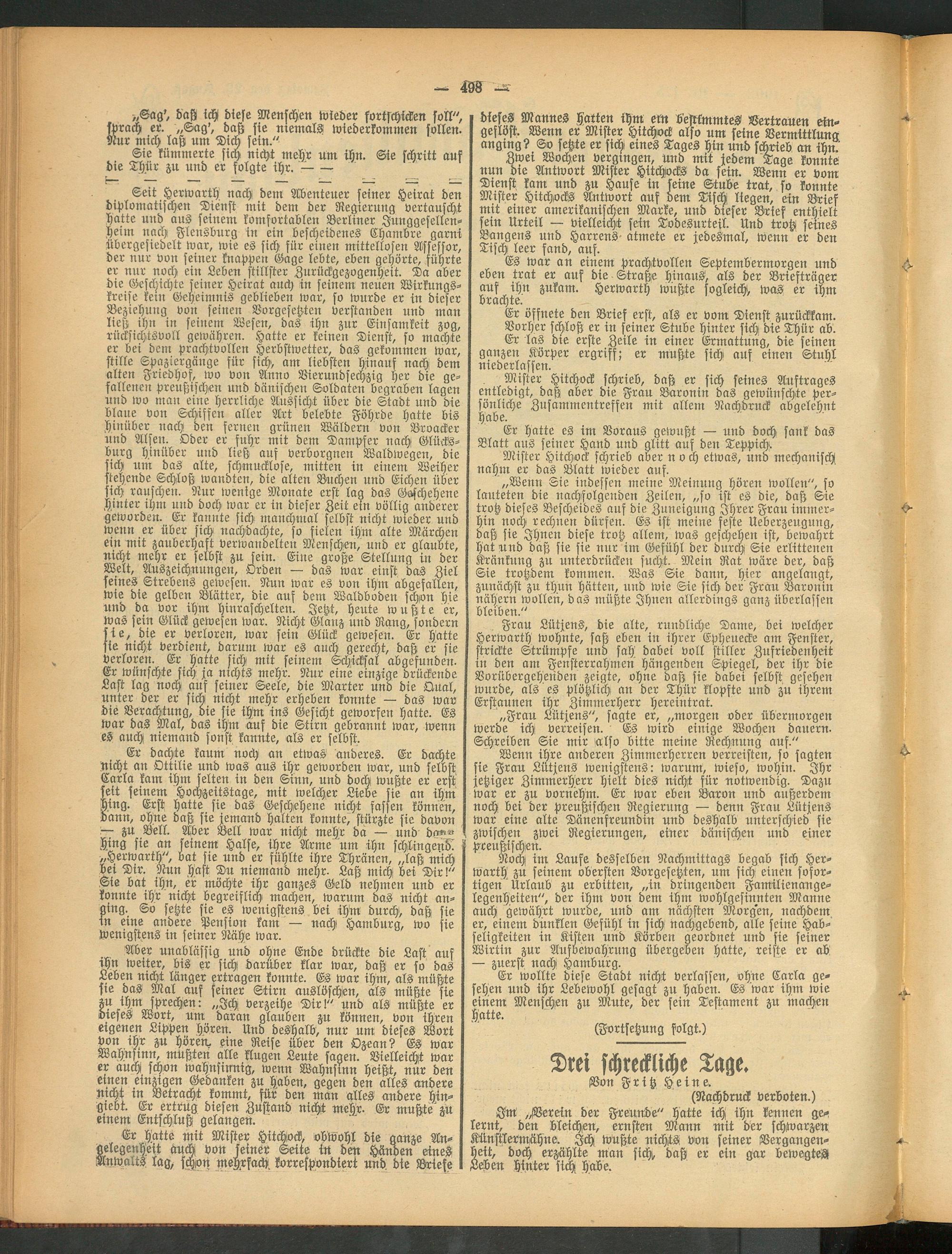 Frau Lütjens, die alte, rundliche Dame, bei welcher Herwarth wohnte, saß eben in ihrer Epheuecke am Fenster, strickte Strümpfe und sah' dabei voll stiller Zufriedenheit in den am Fensterrahmen hängenden Spiegel, der ihr die Vorübergehenden zeigte, ohne daß sie dabei selbst gesehen wurde, als es plötzlich an der Thür klopfte und zu ihrem Erstaunen ihr Zimmerherr hereintrat.