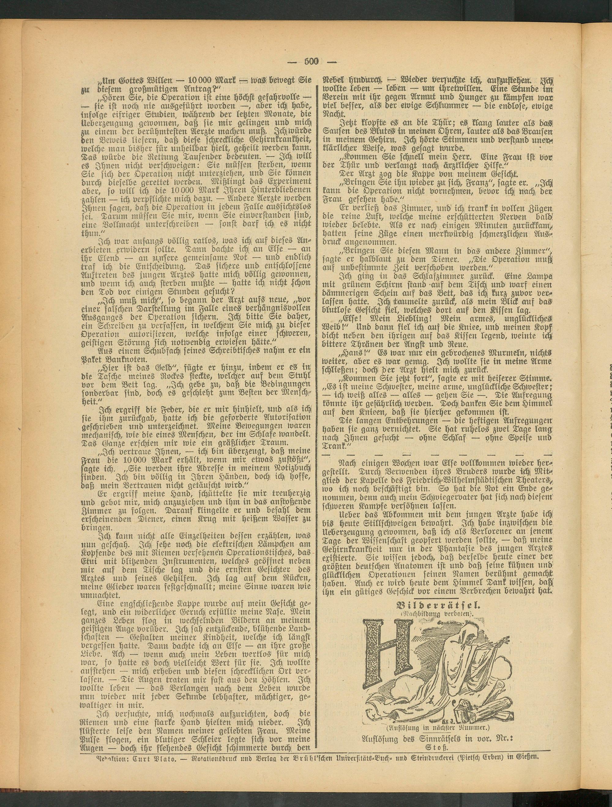 „Ich, muß mich!", so begann der Arzt aufs neue, „vor einer falschen Darstellung im Falle eines verhängnisvollen Ausganges der Operation sichern. Ich bitte Sie daher, ein Schreiben zu verfassen, rn welchem Sie mich zu dieser Operation autorisieren, welche infolge einer schweren, geistigen Störung sich notwendig erwiesen hätte."