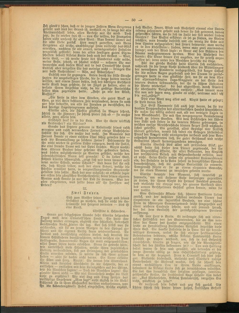 Lch gkaub's schon, daß er in jungen Jahren Wera Sergewna geliebt und dies der Grund ist, weshalb er, so lauge der alte Adelsmarschall lebte, allen Verkehr mit ihr mied. Doch jetzt, da sie wieder frei ist — nun Sie wissen, die Franzosen haben nicht umsonst ihr altes Wort: Man kommt immer auf die alte Liebe zurück. Hier mag's zutreffen, und Wera Sergewna als reiche, unabhängige Frau vielleicht das Glück erreichen, nachdem sie als armes, vermögensloses Fräul->in vergeblich gestrebt; denn bei allen sonstigen guten Eigenschaften bedarf Nikolai Karin doch auch des Geldes. — Aber mein Gott, — ich werde heute des Plauderns nicht müde,' meine Beste, jedoch, es schadet nichts — nehmen Sie nur immerhin auch diesen Wink mit in das Ornatoff'sche Haus Endlich aber vergessen Sie das meinige nicht — bringen Sie Mir bald Nachrichten! — Also, auf Widersehen!