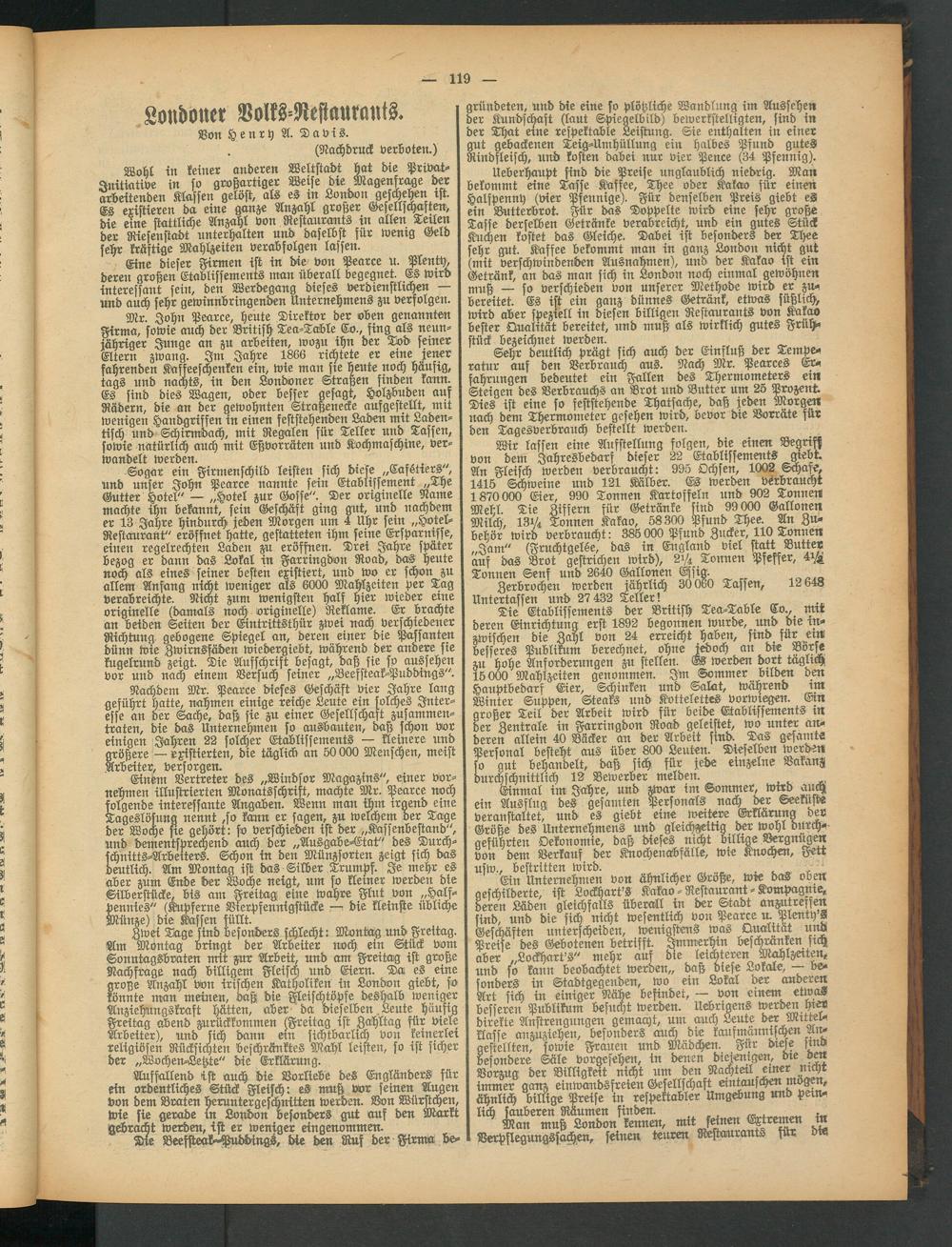 Nachdem Mr. Pearce dieses Geschäft vier Jahre lang geführt hatte, nahmen einige reiche Leute ein solches Interesse an der Sache, daß sie zu einer Gesellschaft zusammentraten, die das Unternehmen so ausbauten, daß schon vor einigen Jahren 22 solcher Etablissements — kleinere und größere — existierten, die täglich an 50 000 Menschen, meist Arbeiter, versorgen.