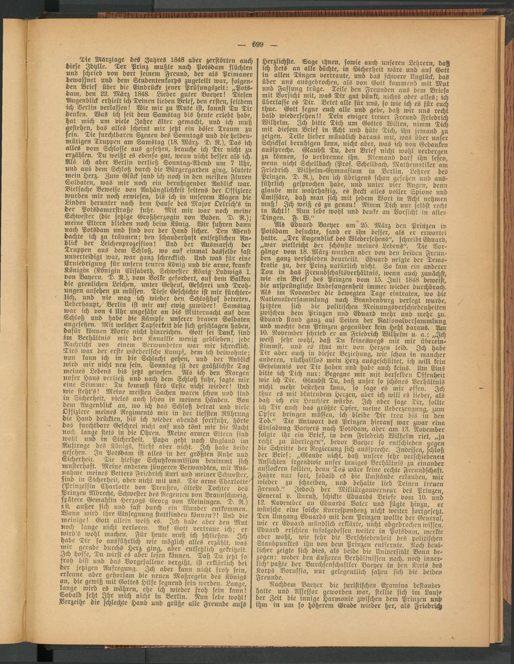 Tie Mürztage des Jahres 1848 aber zerstörten auch diese Idylle. Der Prinz mußte nach Potsdam flüchten und schrieb von dort seinem Freund, der als Primaner bewaffnet und dem Studentenkorps zugeteilt war, folgenden Bries über die Eindrücke jener Prüfungszeit: „Potsdam, den 22. März 1848. Lieber guter Baeyer! Diesen dlugenblick erhielt ich Deinen lieben Brief, den ersten, seitdem ich Berlin verlassen! Wie mir zu Mute ist, kannst Tu Dir denken. Was ich seit dem Samstag bis heute erlebt habe, hat mich um viele Jahre älter gemacht, und ich muß ?gestehen, das alles scheint mir jetzt ein böser Traum zu ein. Tie furchtbaren Szenen des Sonntags und die heldenmütigen Truppen am Samstag (18. März. D. R.), Das ich alles vom Schlosse aus gesehen, brauche ich Dir nicht zu erzählen. Tu weißt es ebenso gut, wenn nicht besser als ich. Als ich aber Berlin verließ Sonntag-Abend um 7 Uhr, und aus dem Schloß durch die Bürgergarden ging, blutete mein Herz. Zum Glück fand ich noch in den meisten Fluren Soldaten, was mir noch ein beruhigender Anblick war. Vielfache Beweise von Anhänglichkeit seitens der Offiziere wurden mir noch erwiesen, bis ich in unserem Wagen die Linden herunter nach dem Hause des Major Oelrtch's in der Potsdamerstraße fuhr. Mit mir war noch meine Schwester (die jetzige Großherzogin von Baden. D R.); meine Eltern blieben noch beim König. Wir fuhren dann nach Potsdam und sind vor der Hand sicher. Den Abend dachte ich zu träumen; den schauderhaft entsetzlichen Anblick der Äeichenprozession! Und der Ausmarsch der Truppen aus dem Schloß, wo auf einmal dasselbe fast unverteidigt war, war ganz schrecklich. Und was für eine Erniedrigung für unfern teuren König und die arme, kranke Königin (Königin Elisabeth, Schwester König Liidwigs I. von Bayern. D. Rch vom Volke gefordert, auf dein Balkon die greulichen Leichen, unter Geheul, Geschrei und Drohungen ansehen zu niüssen. Diese Geschichte ist mir fürchterlich, und nie mag ich wieder den Schloßhof betreten. Ueberhaupt, Berlin ist mir auf ewig zuwider! Samstag war ich von 4 Uhr ungefähr an bis Mitternacht auf dem Schloß und habe die Kämpfe unserer braven Soldaten angesehen. Mit welcher Tapferkeit die sich geschlagen haben, dafür können Worte liicht hinreichen. Gott sei Dank, sind im Verhältnis mit der Kanaille wenig geblieben; jede Nachricht von einem Verwundeten ivar mir schrecklich. Dies war der erste mörderische Kampf, dem ich beiwohnte; nun kann ich in die Schlacht gehen, und der Lknblick wird mir nicht neu sein. Sonntag ist der gräßlichste Tag meines Lebens bis jetzt gewesen. Als ich den Morgen unser Haus verließ und nach dein Schloß fuhr, sagte mir eine Stimme: Du kominst fürs Erste nicht wieder! Und wie steht's! Meine meisten Sachen waren schon und sind rn Sicherheit, vieles auch schon in meinen Händen. Von dem Augenblick an, !vo ich das Schloß betrat und viele Offiziere meines Reginients mir in der tiefsten Rührung die Hand drückten, bis ich wieder abends fortfuhr, hörte das furchtbare Geschrei iiicht auf und tönt mir die Nacht noch lange stets in die Ohren. Meine armen Eltern sind wohl und in Sicherheit. Papa geht nach England im Auftrage des Königs, flieht aber nicht. Ich habe beide gesehen. In Potsdain ist alles iit der größten Ruhe und Sicherheit. Tie hiesige Schutzkommission benimmt sich musterhaft. Meine anderen jüngeren Verwandten, mit Aus- uahme meines Vetters Friedrich Karl und meiner Schwester, suw rn Sicherheit, aber nicht mit uns. Tie arme Charlotte z (Prinzessin Charlotte von Preußen, älteste Tochter des Prinzen Albrecht, Schwester des Regenten von Braunschweig, spatere Gemahlin Herzogs Georg von Meiningen. D. R ) ist, außer sich und fast durch ein Wunder entkommen. Mann ivtrb ihre Einsegnung stattsinden können?! Und die meimge! Gott allein weiß es. Ich habe aber den Mut noch lauge nicht verloren. Auf Gott vertraue ich- er wcrd's ivohl machen. Für heute muß ich schließen. ' Ich habe Dir so ausführlich wie möglich alles erzählt, was surr r gerade durchs Herz ging, aber entsetzlich gekritzelt, rsch hoffe. Tu wirst es aber lesen können. Daß Du jetzt so froh bist und das Vorgefallene vergißt, ist erklärlich bei der jetzigen Aufregung. Ich aber kann nicht froh sein, erkenne aber gehorsam die neuen Maßregeln des Königs an, die gewiß mit Gottes Hilfe segnend sein werden. Lange, lange wird es währen, ehe ich wieder froh sein kann! Sobald seht Ihr mich nicht in Berlin. Nun lebe wohl! Verzeihe die Wechte Hand und grüße alle Freunde aufs