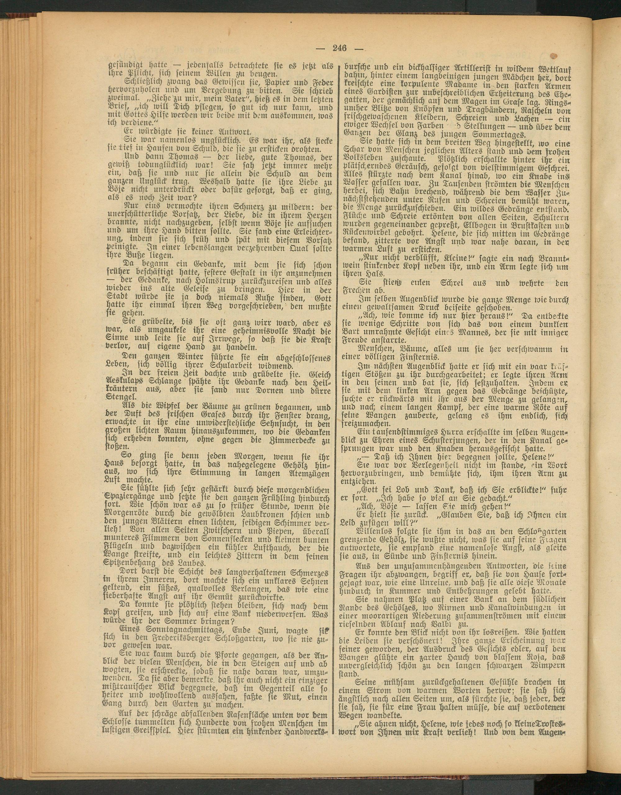 Sie hatte sich in dem breiten Weg hingestellt, wo eine ZHar von Menschen jeglichen Alters stand und dem frohen Volksleben zuschaute. Plötzlich erschallte hinter ihr ein Geräusch, gefolgt von vielstimmigem Geschrei. Alles stürzte nach dem Kanal hinab, wo ein Knabe ins Wasser gefallen war. Zu Tausenden strömten die Menschen herbet, sich Bahn brechend, währetid die dem Wasser Zunächst steh enden unter Rufen und Schreien bemüht waren, die Menge zurückzuschieben. Ein wildes Gedränge entstand. Flüche und Schreie ertönten von allen Seiten, Schultern wurden gegeneinander gepreßt, Ellbogen in Brustkasten und Rückenwirbel gebohrt. Helene, die sich mitten im Gedränge befand, zitterte vor Angst und war nahe daran, in der warmen Luft zu ersticken.