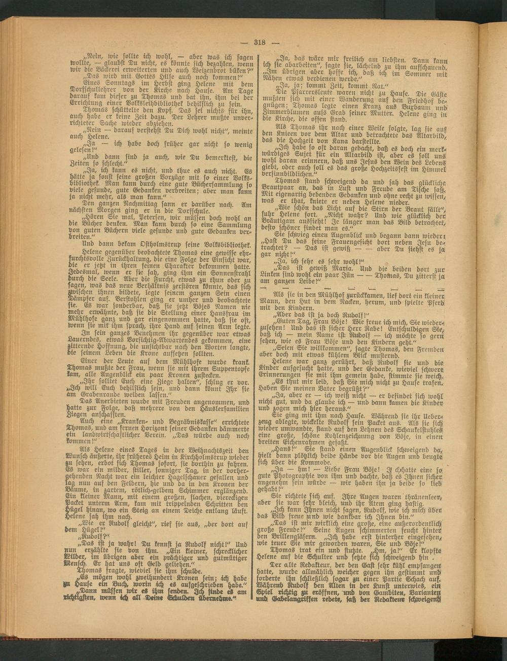 Helene gegenüber beobachtete Thomas eine gewisse ehrfurchtsvolle Zurückhaltung, die eine Folge der Einsicht war, die er jetzt in ihren feinen Charakter bekommen hatte. Jedesmal, wenn er sie sah, ging ihm ein Sonnenstrahl durch die Seele. Aber die Furcht, etwas zu thun oder zu sagen, was das neue Verhältnis zerstören könnte, das sich Uvischen ihnen bildete, legte seinem ganzen Sein einen Dämpfer auf. Verstohlen ging er umher und beobachtete sie. Es war sonderbar, daß sie jetzt Böjes Namen nie wehr erwähnte, daß sie die Stellung einer Hausfrau im Mühlhofe ganz und gar eingenommen hatte, daß sie ost, wenn sie mit ihm sprach, ihre Hand aus seinen Arm legte.
