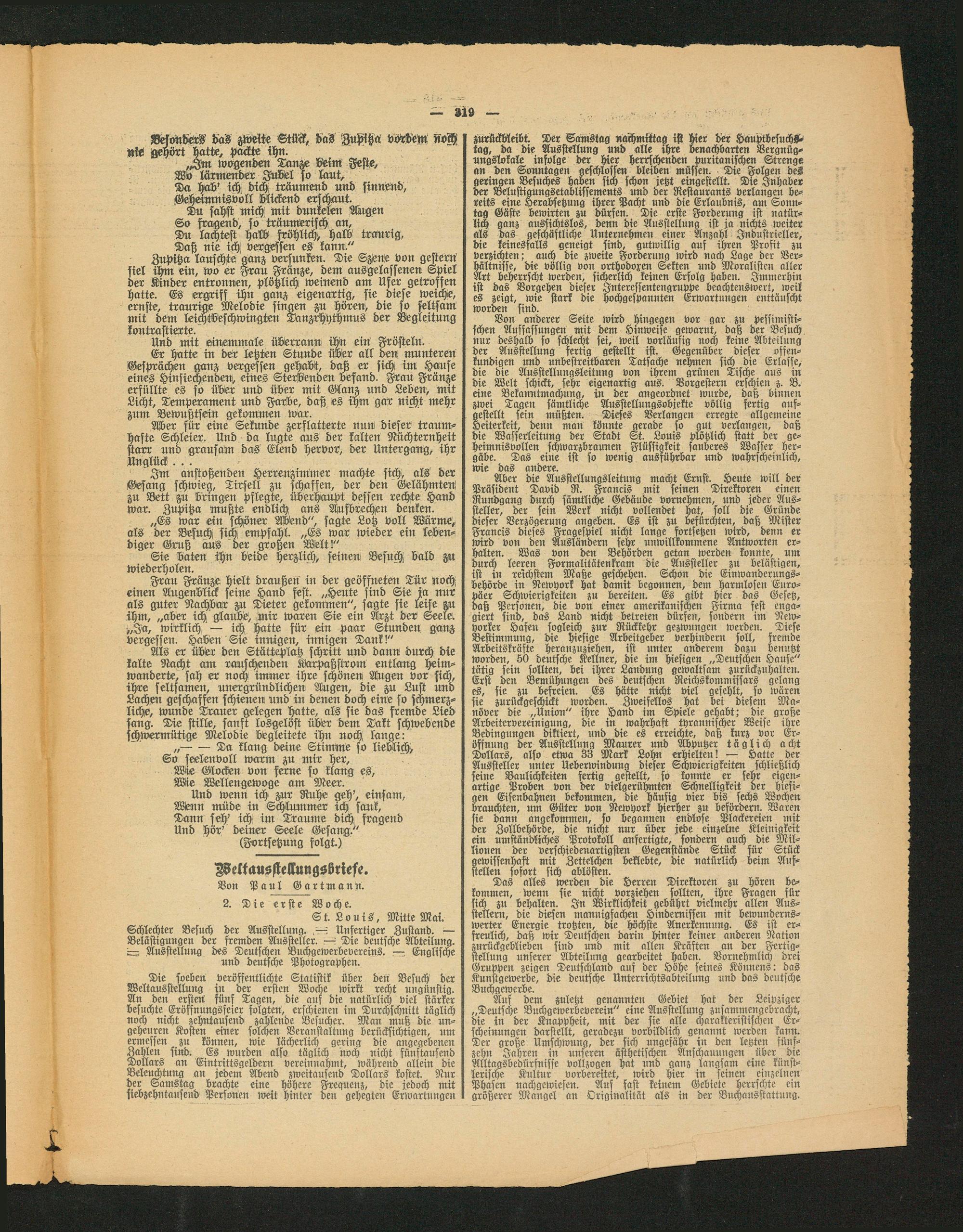 Von anderer Seite wird hingegen vor gar zu pessimistischen Ausfassungen mit dem Hinweise gewarnt, daß der Besuch nur deshalb so schlecht sei, weil vorläufig noch keine Abteilung der Ausstellung fertig gestellt ist. Gegenüber dieser offenkundigen und unbestreitbaren Tatsache nehmen sich die Erlasse, die die Ausstellungsleitung von ihrem grünen Tische aus in die Welt schickt, sehr eigenartig aus. Vorgestern erschien z. B. eine Bekanntmachung, in der angeorduet wurde, daß binnen zwei Tagen sämtliche Ausstellungsobjekte völlig fertig aufgestellt sein müßten. Dieses Verlangen erregte allgemeine Heiterkeit, denn man könnte gerade so gut verlangen, daß die Wasserleitung der Stadt St. Louis plötzlich statt der geheimnisvollen schwarzbraunen Flüssigkeit sauberes Wasser hergäbe. Das eine ist so wenig ausführbar und wahrscheinlich, wie das andere.