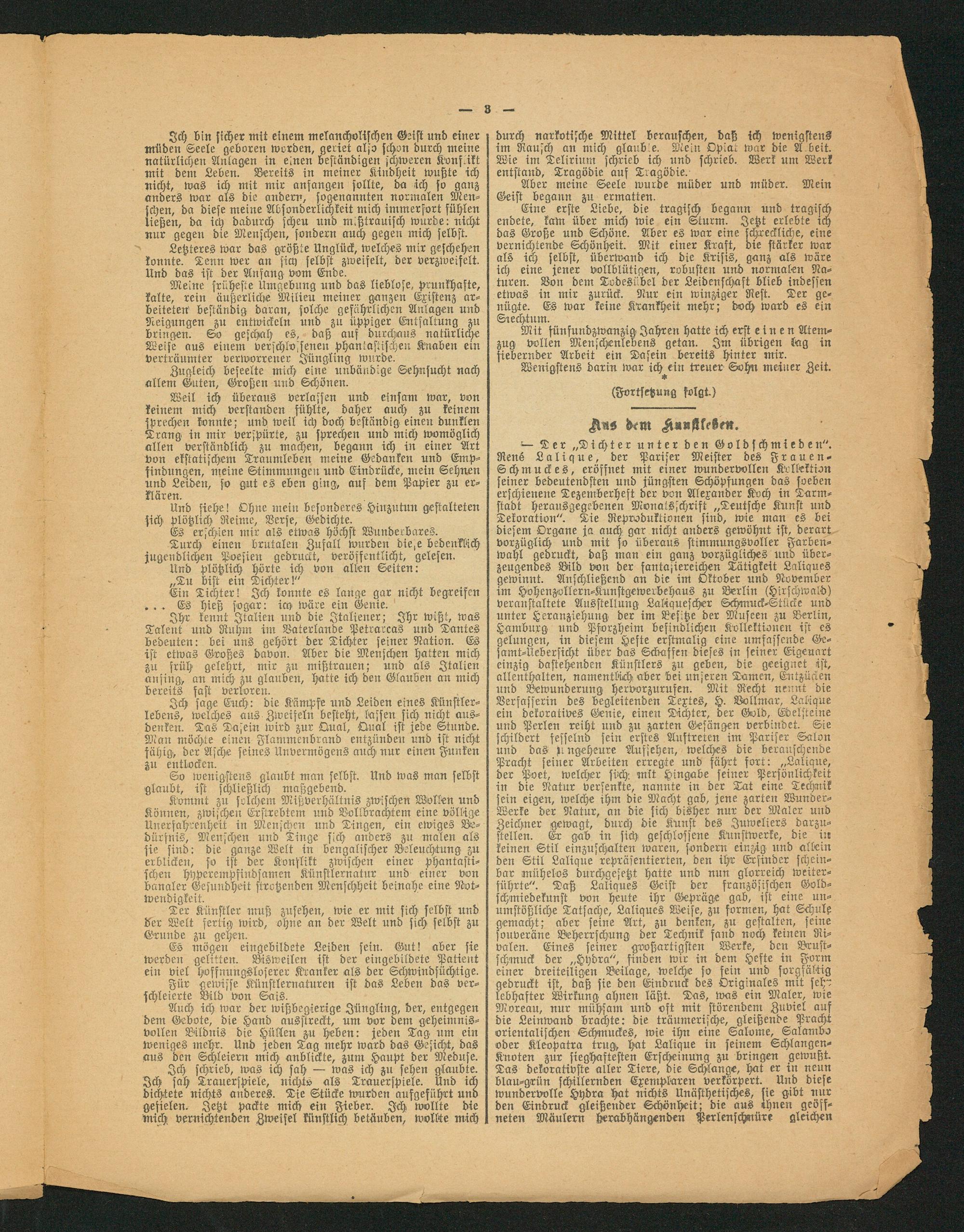 Meine früheste Umgebung und das lieblose, prunkhafte, kalte, rein äußerliche Milieu meiner ganzen Existenz arbeiteten beständig daran, solche gefährlichen Anlagen und Neigungen zu entwickeln und zu üppiger Entsaltung zu bringen. So geschah es, daß auf durchaus natürliche Meise aus einem verschlossenen phantastischen Knaben ein verträumter verworrener Jüngling wn.rde.