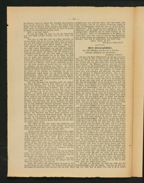 Tas Blumenglöckchen hat in meinem Leben einmal eine andere Gestalt angenommen, damit ich es immer kennen und ernennen sollte, da hieß es Jtty, und sah auf meinem Schoß und hatte goldene Locken und einen Rofenmund, und Himmelsaugen, und mit Himmelsstimme nannte es mich Mutter! Tamals war der ganze Himmel und die ganze Erde für mich voller Glocken, da war die ganze Luft ein einzig Blumen glockenspiel. Und als ich es ganz gut kannte, sodaß ich es immer sehen und immer erkennen und immer hören konnte, da hat es der liebe Gott mir wieder entrückt, immer höher und höher und höher, daß es an feinem Himmel läuten könne, und nun läutet es am Himmel, und in meinem Herzen, den ganzen Tag, die ganze Nacht, zu aller Arbeit, zu allen Gedanken! Es hat mir geholfen, wenn mir niemand half, es hat mich getröstet, da mich; keiner tröstete, das Glöckchen war da, das Glöckchen war nah, das hat mir den Himmel ersetzt und den Himmel nahe gebracht, als ich meinte, der Himmel sei mir für immer verschlossen.