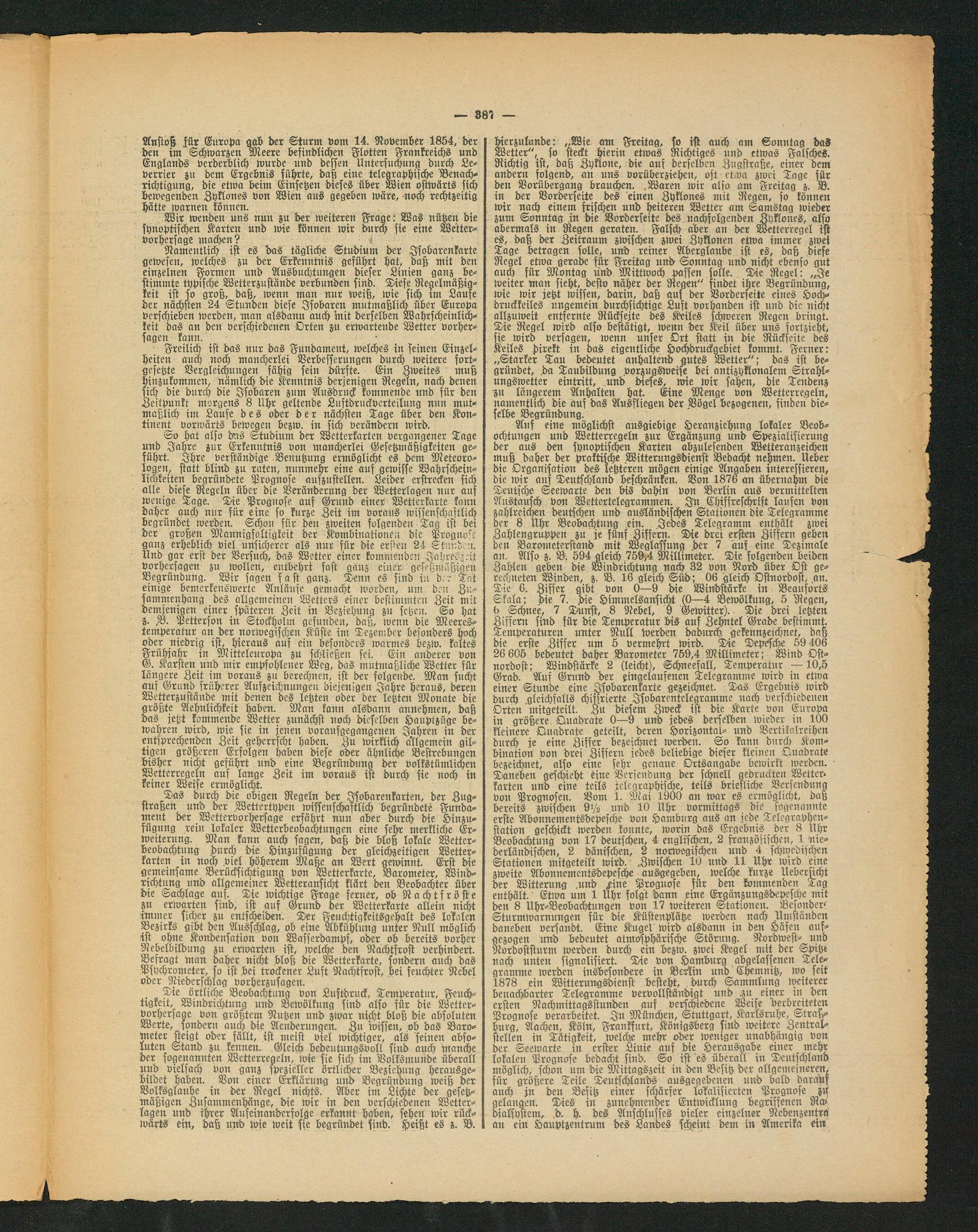 Namentlich ist es das tägliche Studium der Isobarenkarte gewesen, welches zu der Erkenntnis geführt hat, daß mit den einzelnen Formen und Ausbuchtungen dieser Linien ganz bestimmte typische Wetterzustände verbunden sind. Diese Regelmäßigkeit ist so groß, daß, wenn man nur weiß, wie sich mt Laufe der nächsten 24 Stunden diese Isobaren mutmaßlich über Europa verschieben werden, man alsdann auch mit derselben Wahrscheinlichkeit das an den verschiedenen Orten zu erwartende Wetter Vorhersagen kann.