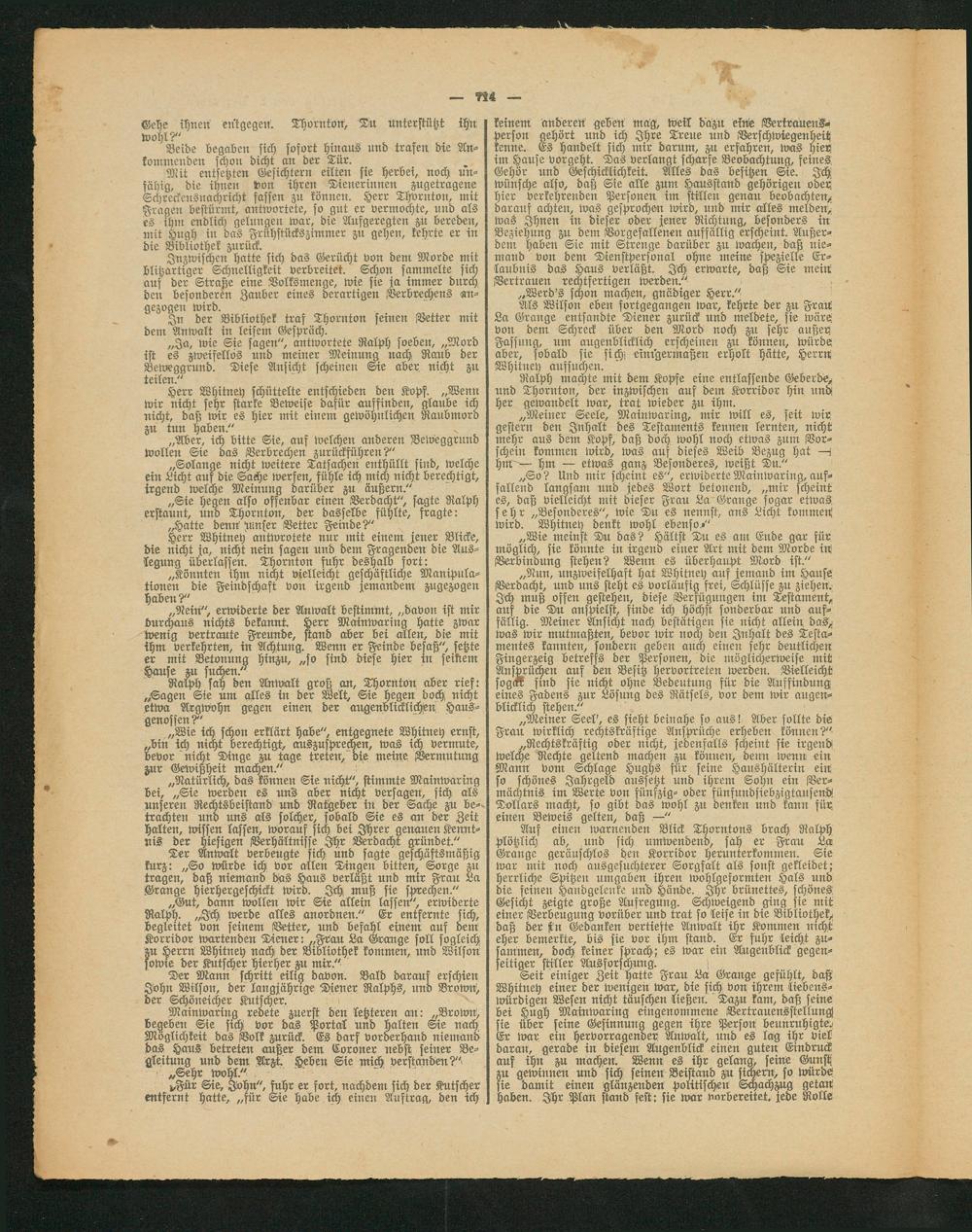 „Gut, dann wollerr wir Sie allem lassen", erwiderte Ralph. „Ich werde alles anordnen." Er entfernte sich, begleitet von seinem Vetter, und befahl einem aus dem Korridor wartenden Diener: „Frau La Grange soll sogleich zu Herrn Whitney nach der Bibliothek kommen, imb Wilson sowie der Kutscher hierher zu mir."
