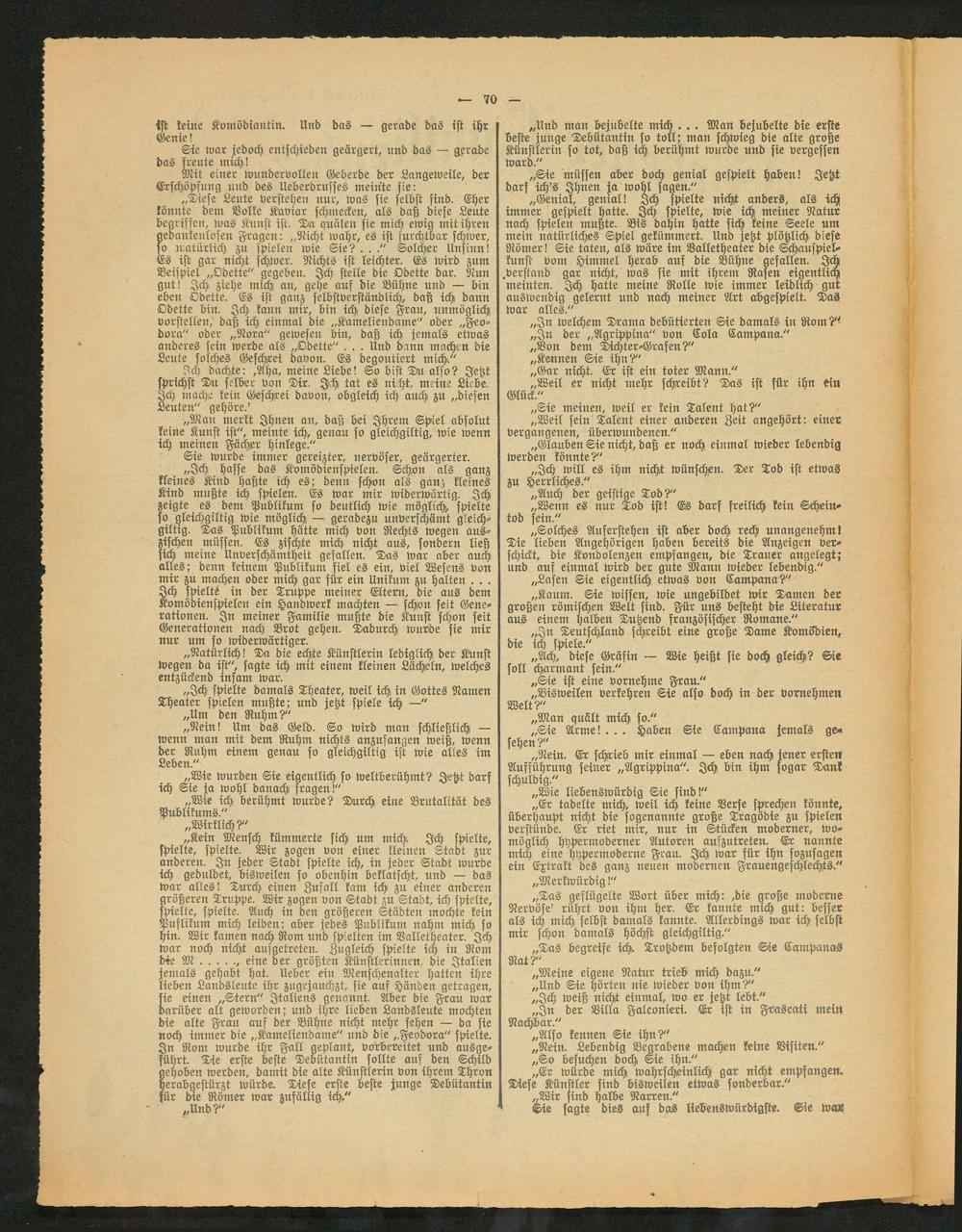 „Kein Mensch kümmerte sich um mich. Ich spielte, spielte, spielte. Wir zogen von einer kleinen Stadt zur anderen. In jeder Stadt spielte ich, in jeder Stadt wurde ich geduldet, bisweilen so obenhin beklatscht, und — das war alles! Durch einen Zufall kam ich zu einer anderen größeren Truppe. Wir zogen von Stadt zu Stadt, ich spielte, spielte, spielte. Auch in den größeren Städten mochte kein Puflikum mich leiden; aber jedes Publikum nahm mich so hin. Wir kamen nach Rom und spielten im Balletheater. Ich war noch nicht aufgetreten. Zugleich spielte ich in Nom die M....., eine der größten Künstlerinnen, die Italien