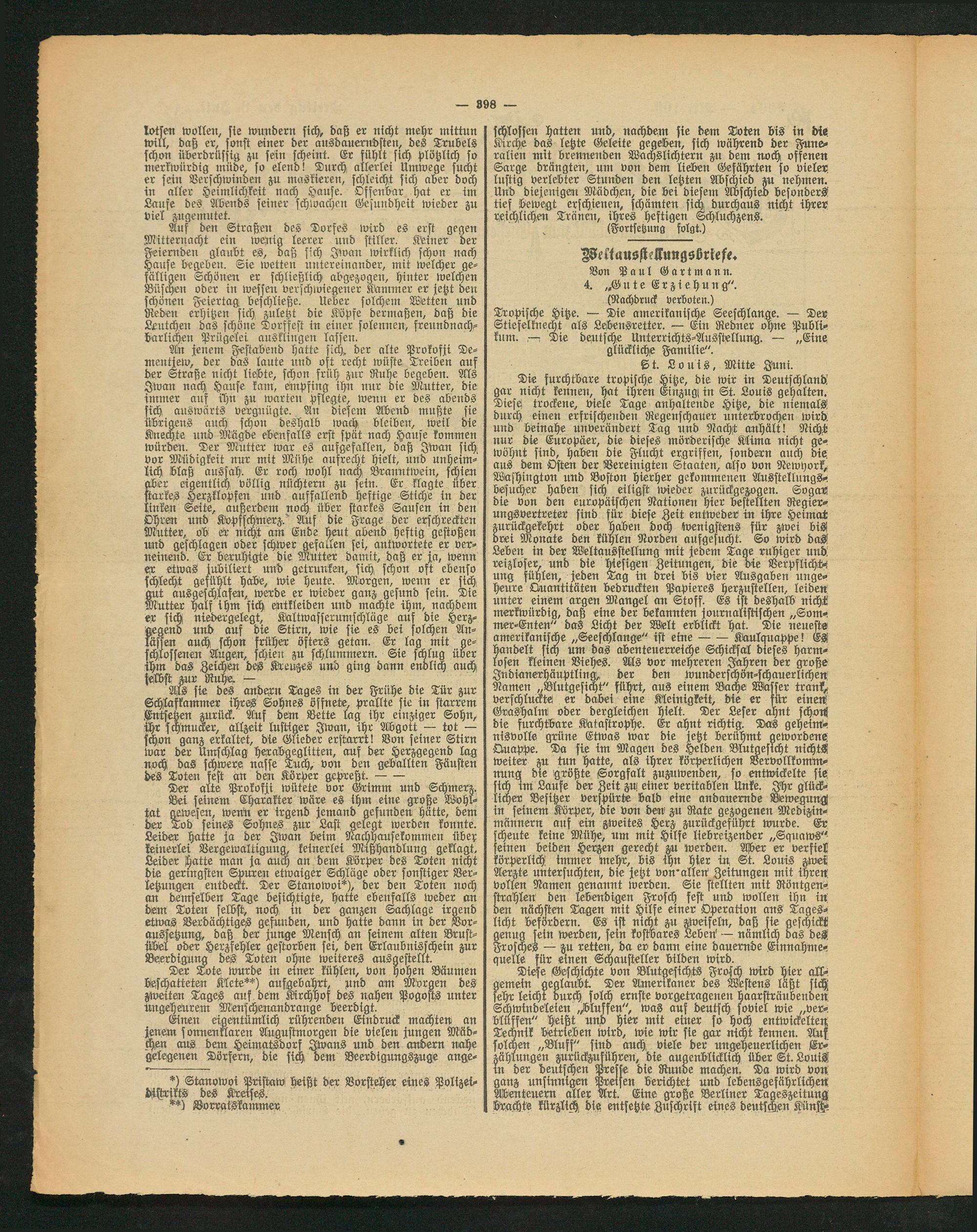 Die furchtbare tropische Hitze, die wir in Deutschland! gar nicht kennen, hat ihren Einzug, in St. Louis gehalten. Diese trockene, viele Tage anhaltende Hitze, die niemals! durch einen erfrischenden Regenschauer unterbrochen wird und beinahe unverändert Tag und Nacht anhält! Nicht nur die Europäer, die dieses mörderische Klima nicht ge- wöhnt sind, haben die Flucht ergriffen, sondern mich die, aus dem Osten der Vereinigten Staaten, also von Newyork, Washington und Boston hierher gekommenen Ausstellungs* besucher haben sich eiligst wieder zurückgezogen. Sogar! die von den europäischen Nationen hier bestellten Regierungsvertreter sind für diese Zeit entweder in ihre Heimat zurückgekehrt oder haben doch wenigstens für zwei bis! drei Monate den kühlen Norden ausgesucht. So wird das! Leben in der Weltausstellung mit jedem Tage ruhiger und! reizloser, und die hiesigen Zeitungen, die die Verpflicht-, ung fühlen, jeden Tag in drei bis vier Ausgaben ungeheure Quantitäten bedruckten Papieres herzustellen, leiden unter einem argen Mangel an Stoff. Es ist deshalb nicht merkwürdig, daß eine der bekannten journalistischen „Sommer-Enten" das Licht der Welt erblickt hat. Die neueste amerikanische „Seeschlange" ist eine--KUulanappe! Es