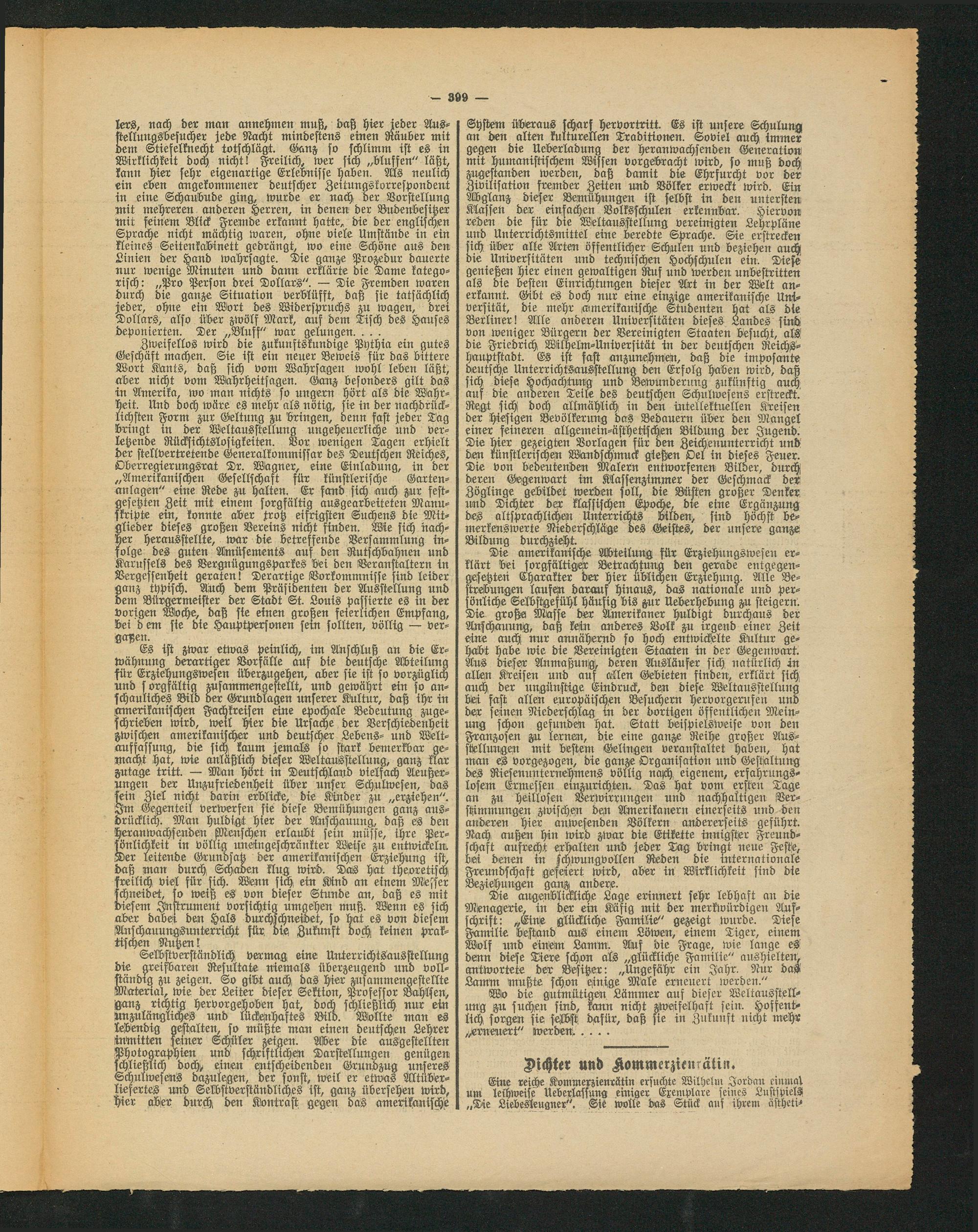 Die amerikanische Abteilung für Erziehungswesen erklärt bei sorgfältiger Betrachtung den gerade entgegengesetzten Charakter der hier üblichen Erziehung. Alle Bestrebungen laufest darauf hinaus, das nationale und persönliche Selbstgefühl häufig bis zur Ueberhebung zu steigern! Die große Masse der Amerikaner huldigt durchaus der Anschauung, daß kein anderes Volk zu irgend einer Zeit eine auch nur annähernd so hoch entwickelte Kultur gehabt habe wie die Vereinigten Staaten in der Gegenwart. Aus dieser Anmaßung- deren Ausläufer sich natürlich in allen Kreisen und auf allen Gebieten finden, erklärt sich auch der ungünstige Eindruck, den diese Weltausstellung bei fast allen europäische Besuchern hervorgerufen und der seinen Niederschlag in der dortigen öffentlichen Meinung schon gesundest hat. Statt beispielsweise von den Franzosen zu lernen, die eine ganze Reihe großer Aus- sljellungest mit bestem Gelingen veranstaltet haben, hat man es vorgezogen, die ganze Organisation und Gestaltung des Riesenunternehmens völlig nach eigenem, erfahrungslosem Ermessen einzurtchten. Das hat vom ersten Tage an zu heillosen Verwirrungen und nachhaltigen Verstimmungen zwischen den Amerikanern einerseits und den anderen hier anwesenden Völkern andererseits geführt. Nach außen hin wird zwar die Etikette innigster Freundschaft aufrecht erhalten und jeder Tag bringt neue Feste, bei denen in schwungvollen Reden die internationale Freundschaft gefeiert wird, abdr in Wirklichkeit sind die Beziehungen ganz anders.